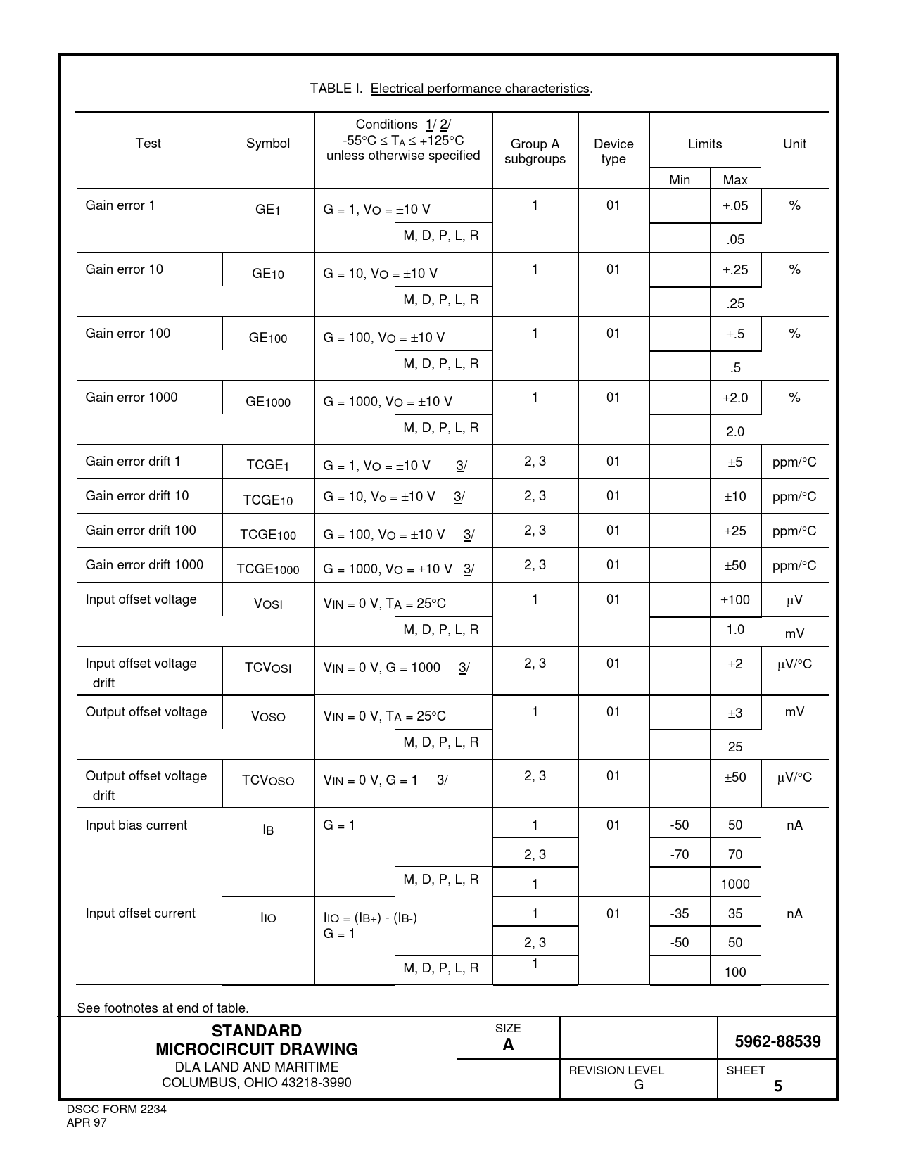 TABLE I. Electrical performance characteristics. Conditions 1/ 2/ Test Symbol -55C  TA  +125C Group A Device Limits Unit unless otherwise specified subgroups type Min Max Gain error 1 GE  1 G = 1, VO = 10 V 1 01 .05 % M, D, P, L, R .05 Gain error 10 GE  10 G = 10, VO = 10 V 1 01 .25 % M, D, P, L, R .25 Gain error 100 GE  100 G = 100, VO = 10 V 1 01 .5 % M, D, P, L, R .5 Gain error 1000 GE  1000 G = 1000, VO = 10 V 1 01 2.0 % M, D, P, L, R 2.0 Gain error drift 1 TCGE  1 G = 1, VO = 10 V 3/ 2, 3 01 5 ppm/C Gain error drift 10 TCGE  10 G = 10, VO = 10 V 3/ 2, 3 01 10 ppm/C Gain error drift 100 TCGE  100 G = 100, VO = 10 V 3/ 2, 3 01 25 ppm/C Gain error drift 1000 TCGE  1000 G = 1000, VO = 10 V 3/ 2, 3 01 50 ppm/C Input offset voltage V   OSI VIN = 0 V, TA = 25C 1 01 100 V M, D, P, L, R 1.0 mV Input offset voltage TCV   OSI VIN = 0 V, G = 1000 3/ 2, 3 01 2 V/C drift Output offset voltage V  OSO VIN = 0 V, TA = 25C 1 01 3 mV M, D, P, L, R 25 Output offset voltage TCV   OSO VIN = 0 V, G = 1 3/ 2, 3 01 50 V/C drift Input bias current IB G = 1 1 01 -50 50 nA 2, 3 -70 70 M, D, P, L, R 1 1000 Input offset current IIO IIO = (IB+) - (IB-) 1 01 -35 35 nA G = 1 2, 3 -50 50 M, D, P, L, R 1 100 See footnotes at end of table.