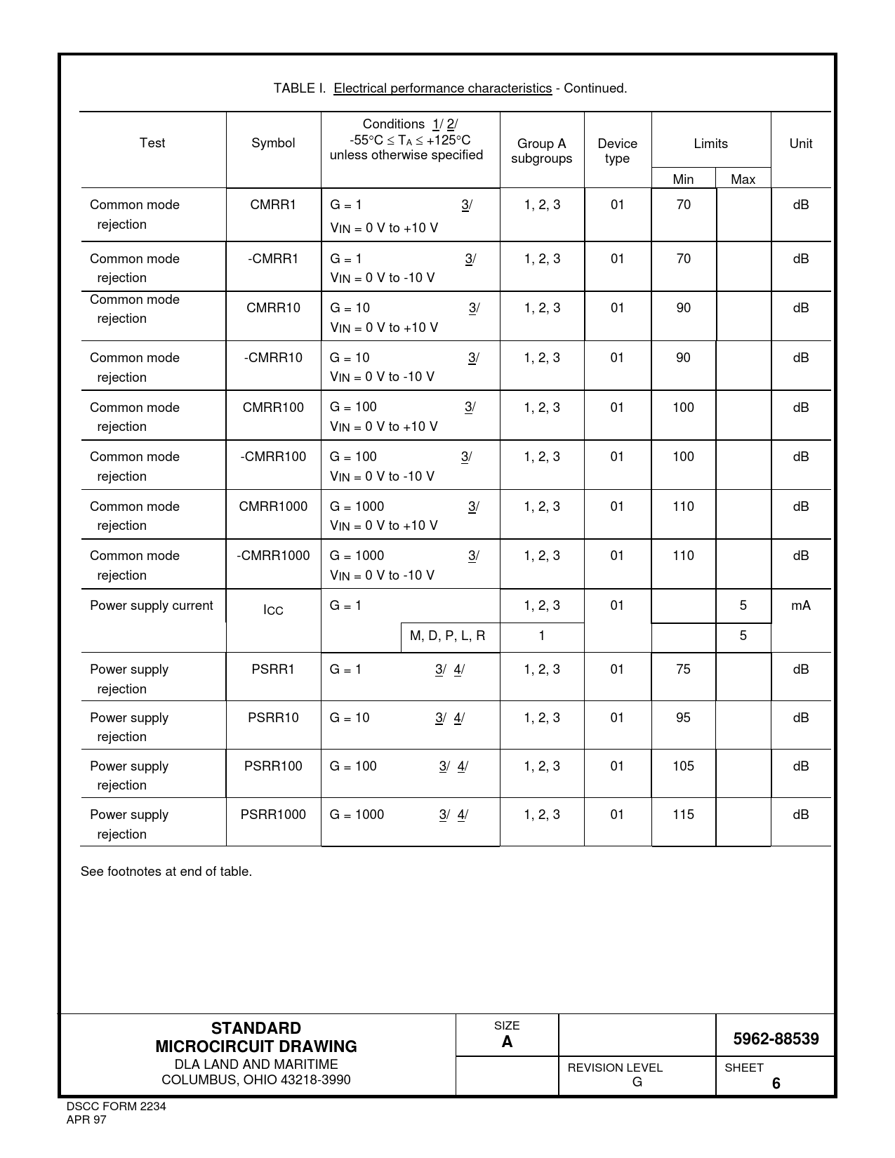 TABLE I. Electrical performance characteristics - Continued. Conditions 1/ 2/ Test Symbol -55C  TA  +125C Group A Device Limits Unit unless otherwise specified subgroups type Min Max Common mode CMRR1 G = 1 3/ 1, 2, 3 01 70 dB rejection VIN = 0 V to +10 V Common mode -CMRR1 G = 1 3/ 1, 2, 3 01 70 dB rejection VIN = 0 V to -10 V Common mode CMRR10 G = 10 3/ 1, 2, 3 01 90 dB rejection VIN = 0 V to +10 V Common mode -CMRR10 G = 10 3/ 1, 2, 3 01 90 dB rejection VIN = 0 V to -10 V Common mode CMRR100 G = 100 3/ 1, 2, 3 01 100 dB rejection VIN = 0 V to +10 V Common mode -CMRR100 G = 100 3/ 1, 2, 3 01 100 dB rejection VIN = 0 V to -10 V Common mode CMRR1000 G = 1000 3/ 1, 2, 3 01 110 dB rejection VIN = 0 V to +10 V Common mode -CMRR1000 G = 1000 3/ 1, 2, 3 01 110 dB rejection VIN = 0 V to -10 V Power supply current ICC G = 1 1, 2, 3 01 5 mA M, D, P, L, R 1 5 Power supply PSRR1 G = 1 3/ 4/ 1, 2, 3 01 75 dB rejection Power supply PSRR10 G = 10 3/ 4/ 1, 2, 3 01 95 dB rejection Power supply PSRR100 G = 100 3/ 4/ 1, 2, 3 01 105 dB rejection Power supply PSRR1000 G = 1000 3/ 4/ 1, 2, 3 01 115 dB rejection See footnotes at end of table.