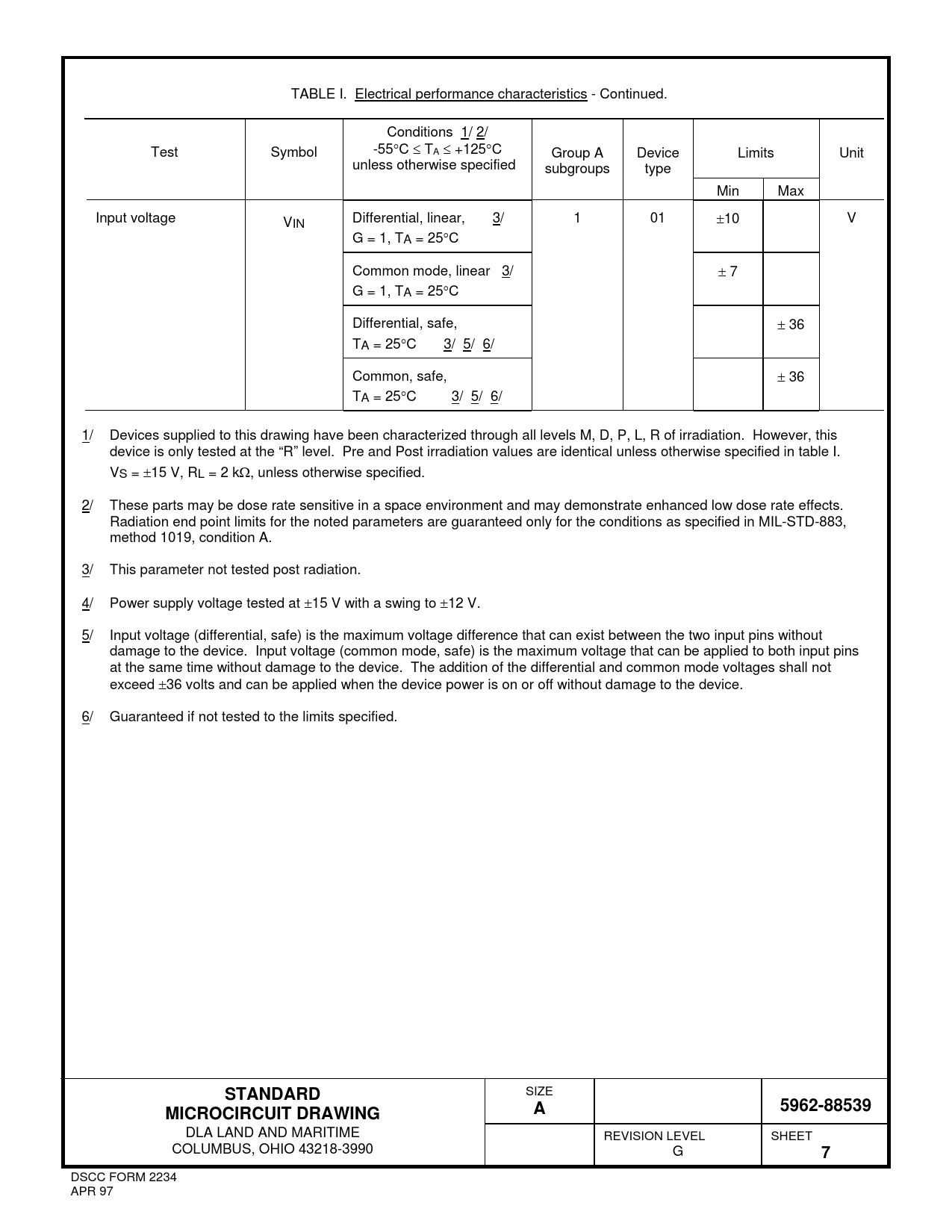 TABLE I. Electrical performance characteristics - Continued. Conditions 1/ 2/ Test Symbol -55C  TA  +125C Group A Device Limits Unit unless otherwise specified subgroups type Min Max Input voltage V  IN Differential, linear, 3/ 1 01 10 V G = 1, TA = 25C Common mode, linear 3/  7 G = 1, TA = 25C Differential, safe,  36 TA = 25C 3/ 5/ 6/ Common, safe,  36 TA = 25C 3/ 5/ 6/ 1/ Devices supplied to this drawing have been characterized through all levels M, D, P, L, R of irradiation. However, this device is only tested at the “R” level. Pre and Post irradiation values are identical unless otherwise specified in table I. VS = 15 V, RL = 2 k, unless otherwise specified. 2/ These parts may be dose rate sensitive in a space environment and may demonstrate enhanced low dose rate effects. Radiation end point limits for the noted parameters are guaranteed only for the conditions as specified in MIL-STD-883, method 1019, condition A. 3/ This parameter not tested post radiation. 4/ Power supply voltage tested at 15 V with a swing to 12 V. 5/ Input voltage (differential, safe) is the maximum voltage difference that can exist between the two input pins without damage to the device. Input voltage (common mode, safe) is the maximum voltage that can be applied to both input pins at the same time without damage to the device. The addition of the differential and common mode voltages shall not exceed 36 volts and can be applied when the device power is on or off without damage to the device. 6/ Guaranteed if not tested to the limits specified.