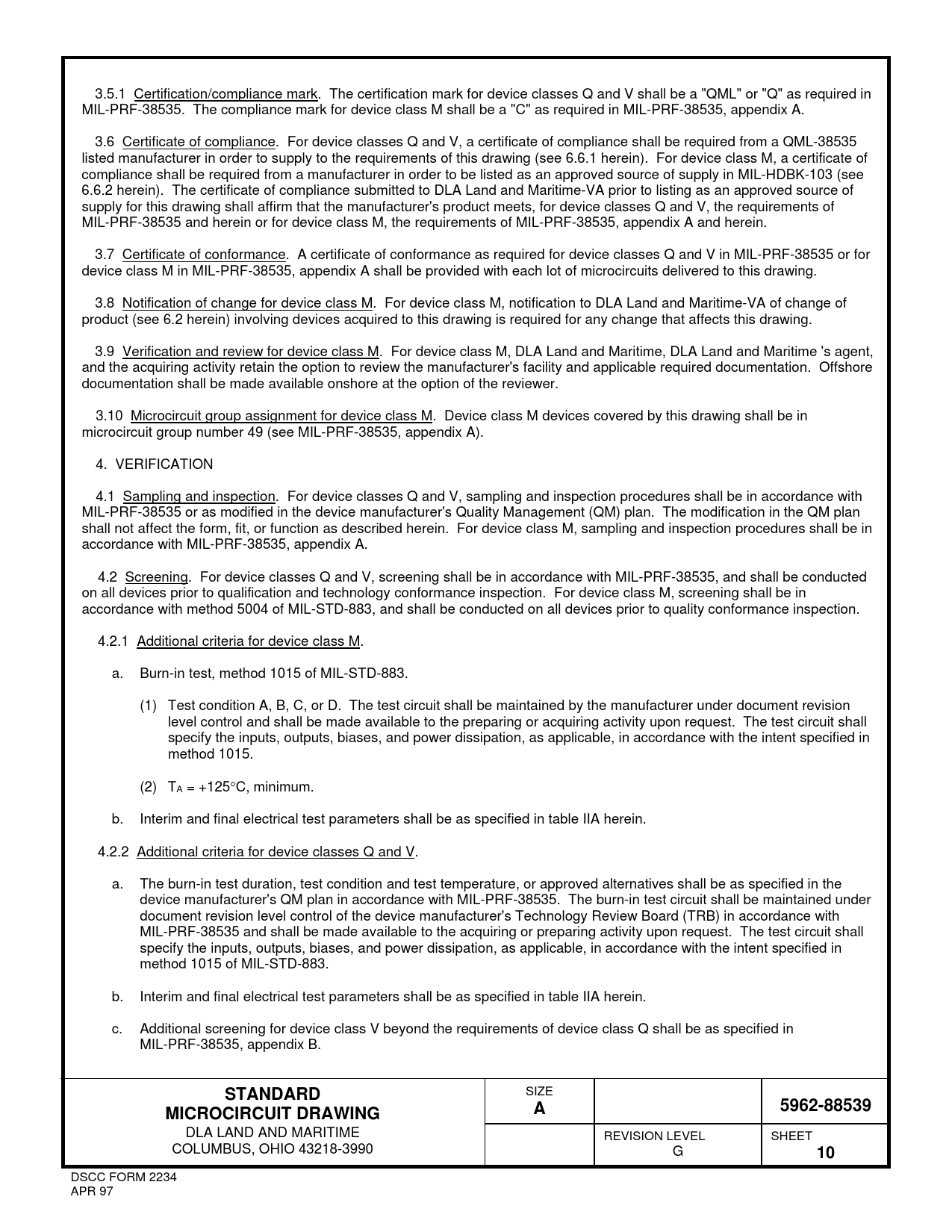 3.5.1 Certification/compliance mark. The certification mark for device classes Q and V shall be a "QML" or "Q" as required in MIL-PRF-38535. The compliance mark for device class M shall be a "C" as required in MIL-PRF-38535, appendix A. 3.6 Certificate of compliance. For device classes Q and V, a certificate of compliance shall be required from a QML-38535 listed manufacturer in order to supply to the requirements of this drawing (see 6.6.1 herein). For device class M, a certificate of compliance shall be required from a manufacturer in order to be listed as an approved source of supply in MIL-HDBK-103 (see 6.6.2 herein). The certificate of compliance submitted to DLA Land and Maritime-VA prior to listing as an approved source of supply for this drawing shall affirm that the manufacturer's product meets, for device classes Q and V, the requirements of MIL-PRF-38535 and herein or for device class M, the requirements of MIL-PRF-38535, appendix A and herein. 3.7 Certificate of conformance. A certificate of conformance as required for device classes Q and V in MIL-PRF-38535 or for device class M in MIL-PRF-38535, appendix A shall be provided with each lot of microcircuits delivered to this drawing. 3.8 Notification of change for device class M. For device class M, notification to DLA Land and Maritime-VA of change of product (see 6.2 herein) involving devices acquired to this drawing is required for any change that affects this drawing. 3.9 Verification and review for device class M. For device class M, DLA Land and Maritime, DLA Land and Maritime 's agent, and the acquiring activity retain the option to review the manufacturer's facility and applicable required documentation. Offshore documentation shall be made available onshore at the option of the reviewer. 3.10 Microcircuit group assignment for device class M. Device class M devices covered by this drawing shall be in microcircuit group number 49 (see MIL-PRF-38535, appendix A). 4. VERIFICATION 4.1 Sampling and inspection. For device classes Q and V, sampling and inspection procedures shall be in accordance with MIL-PRF-38535 or as modified in the device manufacturer's Quality Management (QM) plan. The modification in the QM plan shall not affect the form, fit, or function as described herein. For device class M, sampling and inspection procedures shall be in accordance with MIL-PRF-38535, appendix A. 4.2 Screening. For device classes Q and V, screening shall be in accordance with MIL-PRF-38535, and shall be conducted on all devices prior to qualification and technology conformance inspection. For device class M, screening shall be in accordance with method 5004 of MIL-STD-883, and shall be conducted on all devices prior to quality conformance inspection. 4.2.1 Additional criteria for device class M. a. Burn-in test, method 1015 of MIL-STD-883. (1) Test condition A, B, C, or D. The test circuit shall be maintained by the manufacturer under document revision level control and shall be made available to the preparing or acquiring activity upon request. The test circuit shall specify the inputs, outputs, biases, and power dissipation, as applicable, in accordance with the intent specified in method 1015. (2) TA = +125C, minimum. b. Interim and final electrical test parameters shall be as specified in table IIA herein. 4.2.2 Additional criteria for device classes Q and V. a. The burn-in test duration, test condition and test temperature, or approved alternatives shall be as specified in the device manufacturer's QM plan in accordance with MIL-PRF-38535. The burn-in test circuit shall be maintained under document revision level control of the device manufacturer's Technology Review Board (TRB) in accordance with MIL-PRF-38535 and shall be made available to the acquiring or preparing activity upon request. The test circuit shall specify the inputs, outputs, biases, and power dissipation, as applicable, in accordance with the intent specified in method 1015 of MIL-STD-883. b. Interim and final electrical test parameters shall be as specified in table IIA herein. c. Additional screening for device class V beyond the requirements of device class Q shall be as specified in MIL-PRF-38535, appendix B.