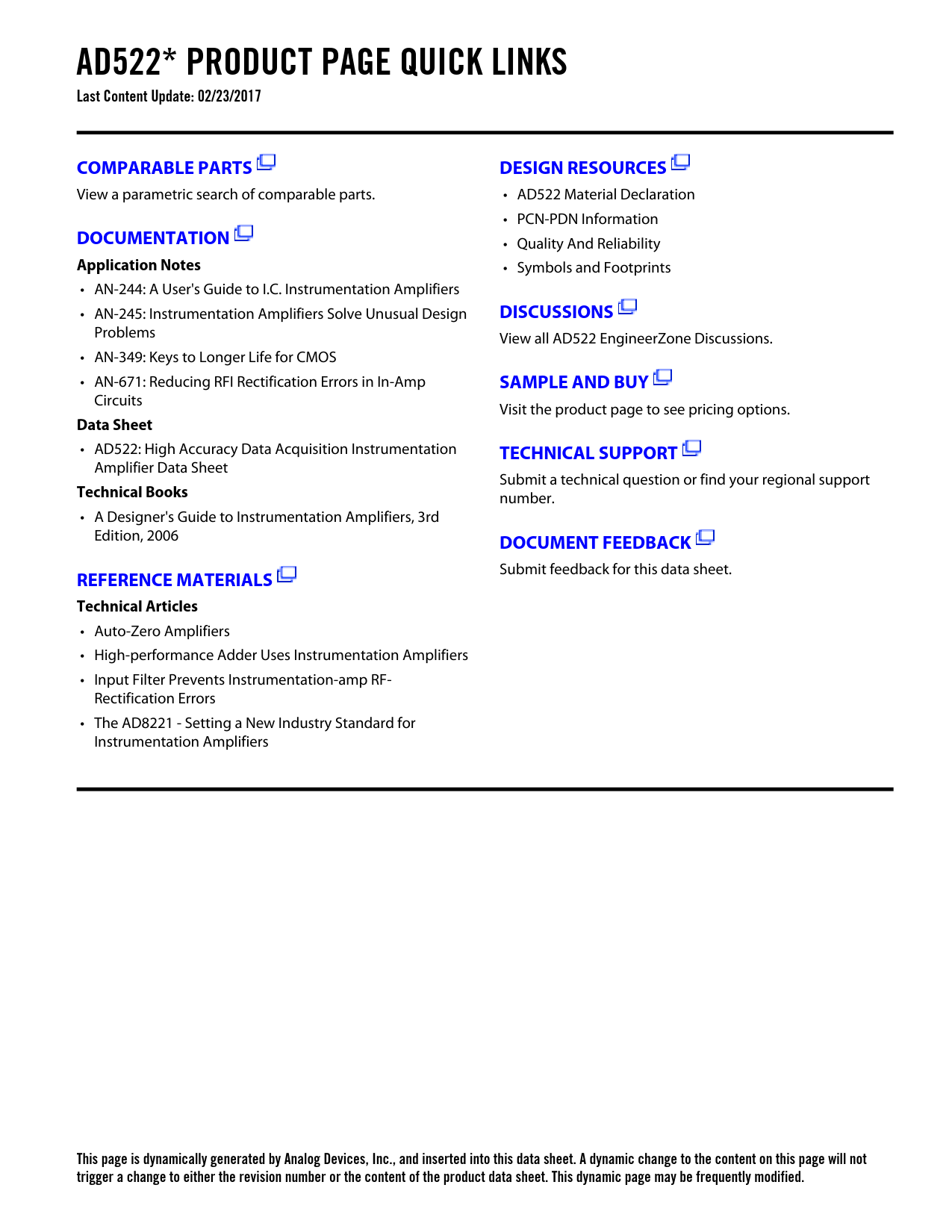 AD522* PRODUCT PAGE QUICK LINKS Last Content Update: 02/23/2017COMPARABLE PARTSDESIGN RESOURCES View a parametric search of comparable parts. • AD522 Material Declaration • PCN-PDN Information DOCUMENTATION • Quality And Reliability Application Notes • Symbols and Footprints • AN-244: A User's Guide to I.C. Instrumentation Amplifiers • AN-245: Instrumentation Amplifiers Solve Unusual Design DISCUSSIONS Problems View all AD522 EngineerZone Discussions. • AN-349: Keys to Longer Life for CMOS • AN-671: Reducing RFI Rectification Errors in In-Amp SAMPLE AND BUY Circuits Visit the product page to see pricing options. Data Sheet • AD522: High Accuracy Data Acquisition Instrumentation TECHNICAL SUPPORT Amplifier Data Sheet Submit a technical question or find your regional support Technical Books number. • A Designer's Guide to Instrumentation Amplifiers, 3rd Edition, 2006 DOCUMENT FEEDBACK Submit feedback for this data sheet. REFERENCE MATERIALSTechnical Articles • Auto-Zero Amplifiers • High-performance Adder Uses Instrumentation Amplifiers • Input Filter Prevents Instrumentation-amp RF- Rectification Errors • The AD8221 - Setting a New Industry Standard for Instrumentation Amplifiers This page is dynamically generated by Analog Devices, Inc., and inserted into this data sheet. A dynamic change to the content on this page will not trigger a change to either the revision number or the content of the product data sheet. This dynamic page may be frequently modified.