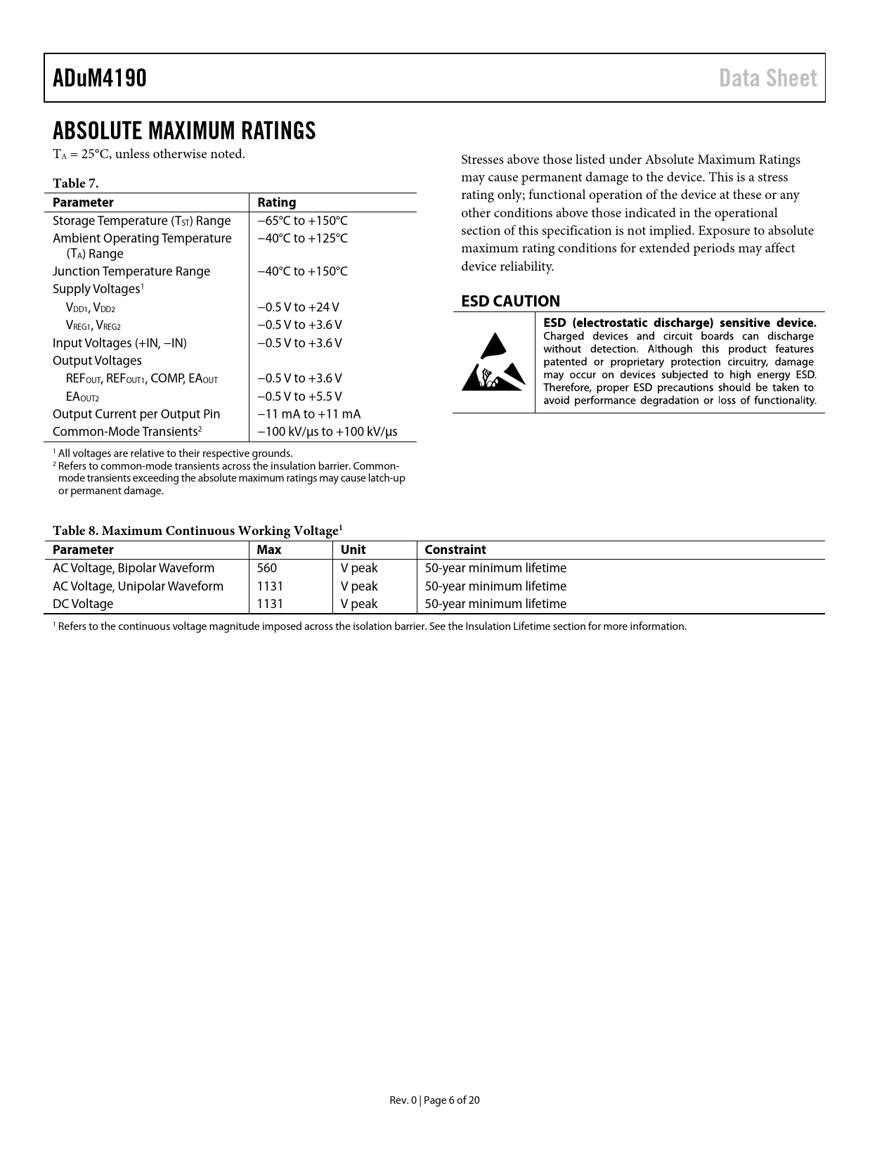 link to page 17 link to page 7 link to page 7 link to page 7 ADuM4190Data SheetABSOLUTE MAXIMUM RATINGS TA = 25°C, unless otherwise noted. Stresses above those listed under Absolute Maximum Ratings Table 7. may cause permanent damage to the device. This is a stress ParameterRating rating only; functional operation of the device at these or any other conditions above those indicated in the operational Storage Temperature (TST) Range −65°C to +150°C section of this specification is not implied. Exposure to absolute Ambient Operating Temperature −40°C to +125°C (T maximum rating conditions for extended periods may affect A) Range Junction Temperature Range −40°C to +150°C device reliability. Supply Voltages1 V ESD CAUTION DD1, VDD2 −0.5 V to +24 V VREG1, VREG2 −0.5 V to +3.6 V Input Voltages (+IN, −IN) −0.5 V to +3.6 V Output Voltages REFOUT, REFOUT1, COMP, EAOUT −0.5 V to +3.6 V EAOUT2 −0.5 V to +5.5 V Output Current per Output Pin −11 mA to +11 mA Common-Mode Transients2 −100 kV/µs to +100 kV/µs 1 All voltages are relative to their respective grounds. 2 Refers to common-mode transients across the insulation barrier. Common- mode transients exceeding the absolute maximum ratings may cause latch-up or permanent damage. Table 8. Maximum Continuous Working Voltage1ParameterMaxUnitConstraint AC Voltage, Bipolar Waveform 560 V peak 50-year minimum lifetime AC Voltage, Unipolar Waveform 1131 V peak 50-year minimum lifetime DC Voltage 1131 V peak 50-year minimum lifetime 1 Refers to the continuous voltage magnitude imposed across the isolation barrier. See the Insulation Lifetime section for more information. Rev. 0 | Page 6 of 20 Document Outline Features Applications General Description Functional Block Diagram Table of Contents Revision History Specifications Package Characteristics Regulatory Information Insulation and Safety Related Specifications Recommended Operating Conditions DIN V VDE V 0884-10 (VDE V 0884-10):2006-12 Insulation Characteristics Absolute Maximum Ratings ESD Caution Pin Configuration and Function Descriptions Typical Performance Characteristics Test Circuits Applications Information Accuracy Circuit Operation Isolated Amplifier Circuit Operation Application Block Diagram Setting the Output Voltage DOSA Module Application DC Correctness and Magnetic Field Immunity Insulation Lifetime Outline Dimensions Ordering Guide