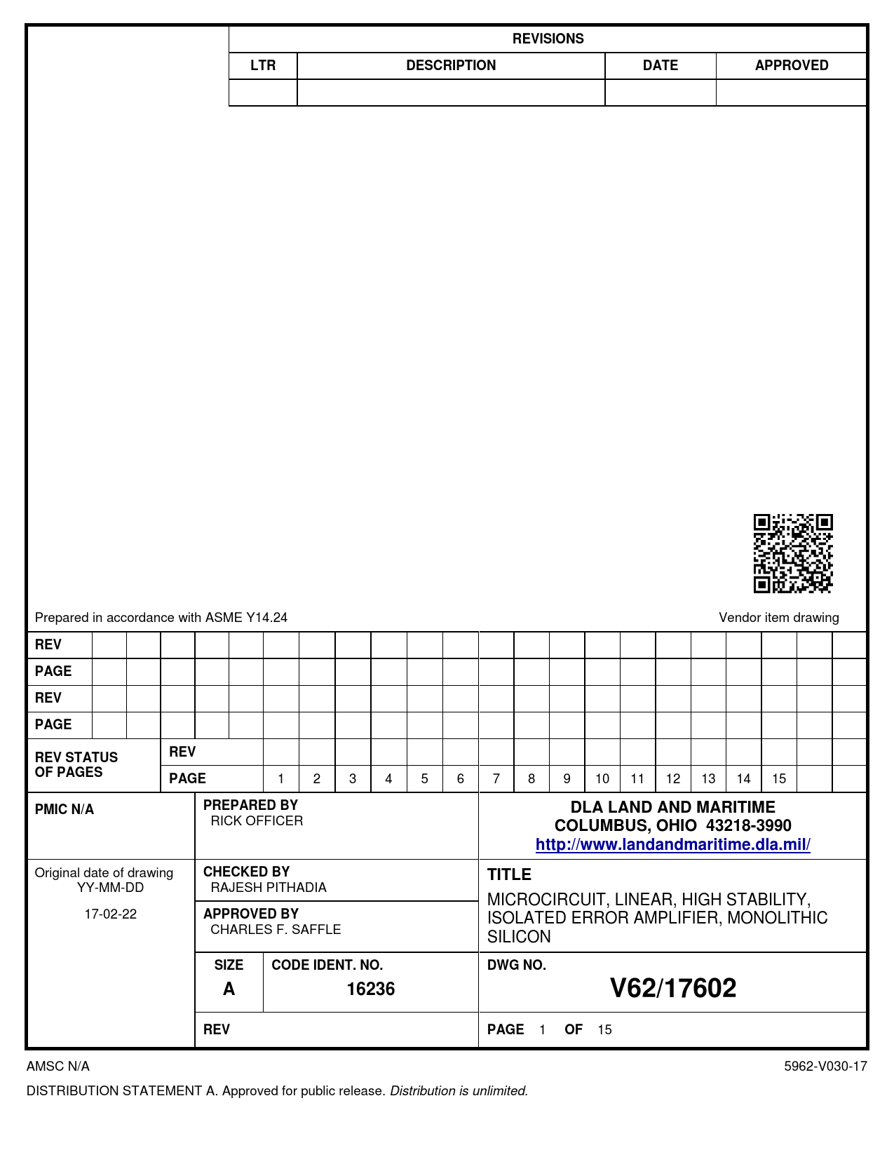 15 AMSC N/A 5962-V030-17 DISTRIBUTION STATEMENT A. Approved for public release. Distribution is unlimited.