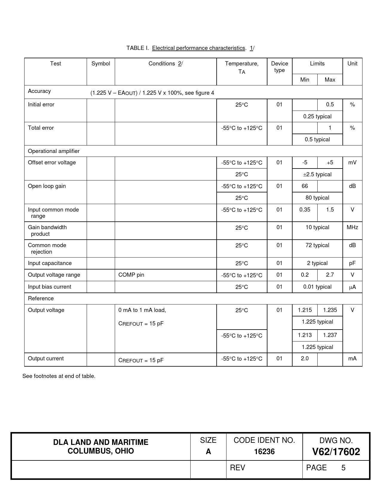 TABLE I. Electrical performance characteristics. 1/ Test Symbol Conditions 2/ Temperature, Device Limits Unit TA type Min Max Accuracy (1.225 V – EAOUT) / 1.225 V x 100%, see figure 4 Initial error 25C 01 0.5 % 0.25 typical Total error -55C to +125C 01 1 % 0.5 typical Operational amplifier Offset error voltage -55C to +125C 01 -5 +5 mV 25C 2.5 typical Open loop gain -55C to +125C 01 66 dB 25C 80 typical Input common mode -55C to +125C 01 0.35 1.5 V range Gain bandwidth 25C 01 10 typical MHz product Common mode 25C 01 72 typical dB rejection Input capacitance 25C 01 2 typical pF Output voltage range COMP pin -55C to +125C 01 0.2 2.7 V Input bias current 25C 01 0.01 typical A Reference Output voltage 0 mA to 1 mA load, 25C 01 1.215 1.235 V CREFOUT = 15 pF 1.225 typical -55C to +125C 1.213 1.237 1.225 typical Output current CREFOUT = 15 pF -55C to +125C 01 2.0 mA See footnotes at end of table.