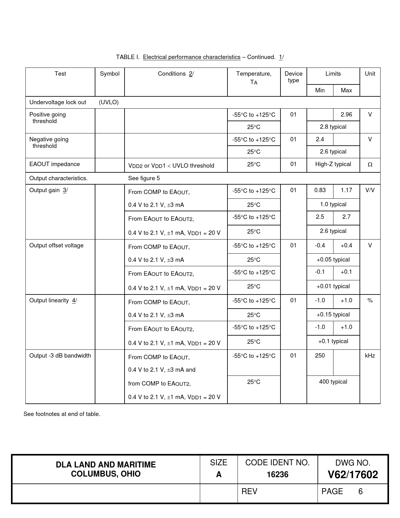 TABLE I. Electrical performance characteristics – Continued. 1/ Test Symbol Conditions 2/ Temperature, Device Limits Unit TA type Min Max Undervoltage lock out (UVLO) Positive going -55C to +125C 01 2.96 V threshold 25C 2.8 typical Negative going -55C to +125C 01 2.4 V threshold 25C 2.6 typical EAOUT impedance VDD2 or VDD1  UVLO threshold 25C 01 High-Z typical Output characteristics. See figure 5 Output gain 3/ From COMP to EAOUT, -55C to +125C 01 0.83 1.17 V/V 0.4 V to 2.1 V, 3 mA 25C 1.0 typical From EAOUT to EAOUT2, -55C to +125C 2.5 2.7 0.4 V to 2.1 V, 1 mA, VDD1 = 20 V 25C 2.6 typical Output offset voltage From COMP to EAOUT, -55C to +125C 01 -0.4 +0.4 V 0.4 V to 2.1 V, 3 mA 25C +0.05 typical From EAOUT to EAOUT2, -55C to +125C -0.1 +0.1 0.4 V to 2.1 V, 1 mA, VDD1 = 20 V 25C +0.01 typical Output linearity 4/ From COMP to EAOUT, -55C to +125C 01 -1.0 +1.0 % 0.4 V to 2.1 V, 3 mA 25C +0.15 typical From EAOUT to EAOUT2, -55C to +125C -1.0 +1.0 0.4 V to 2.1 V, 1 mA, VDD1 = 20 V 25C +0.1 typical Output -3 dB bandwidth From COMP to EAOUT, -55C to +125C 01 250 kHz 0.4 V to 2.1 V, 3 mA and from COMP to EAOUT2, 25C 400 typical 0.4 V to 2.1 V, 1 mA, VDD1 = 20 V See footnotes at end of table.