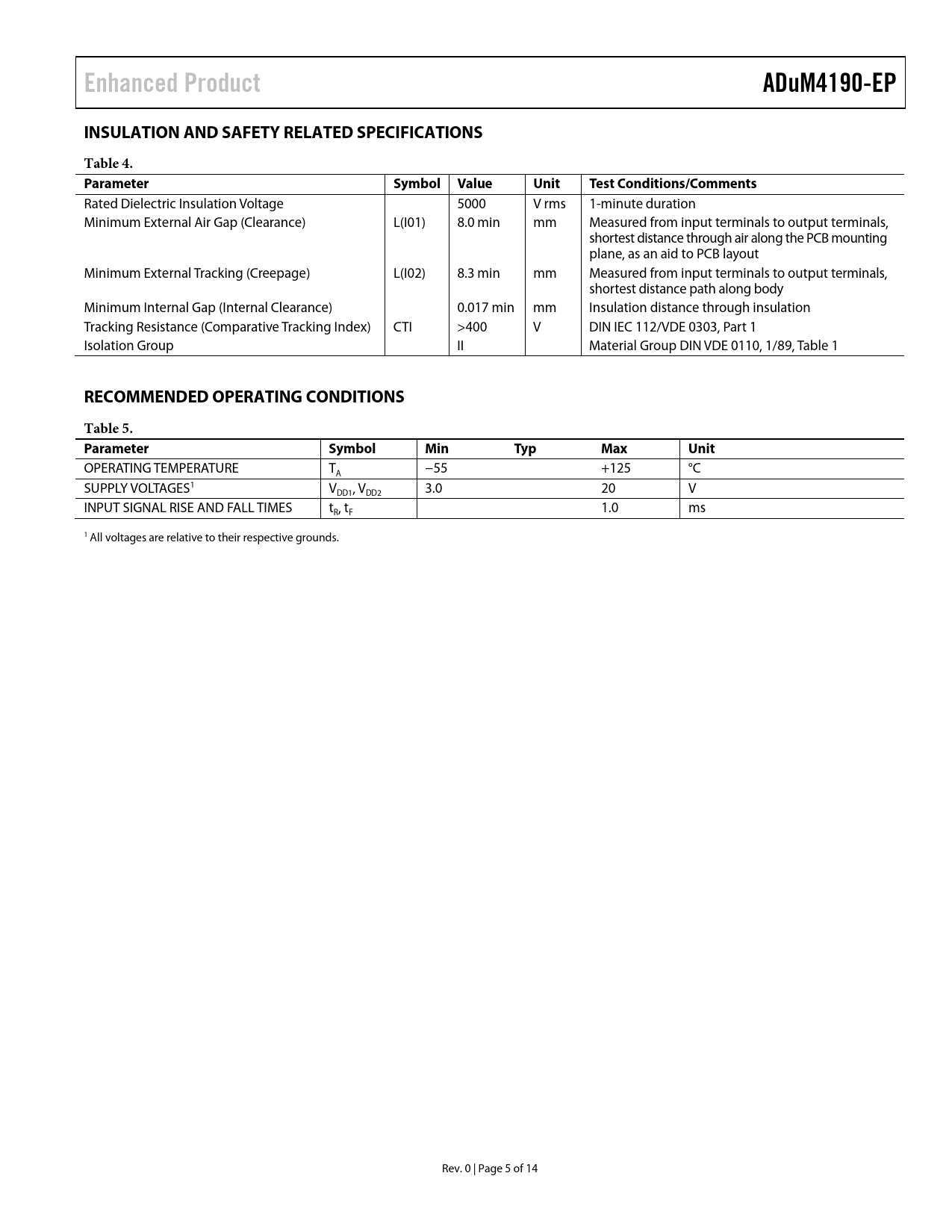Enhanced Product. ADuM4190-EP. INSULATION AND SAFETY RELATED SPECIFICATIONS. Table 4. Parameter. Symbol Value. Unit