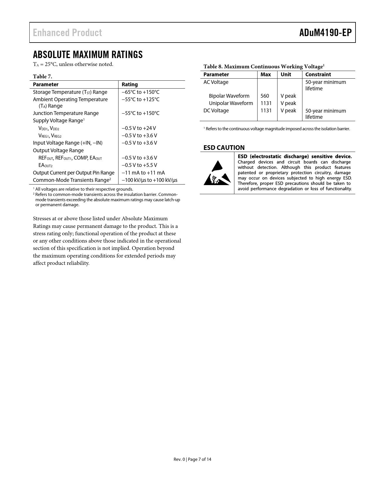 Enhanced Product. ADuM4190-EP. ABSOLUTE MAXIMUM RATINGS. Table 8. Maximum Continuous Working Voltage1. Table 7. Parameter Max. Unit