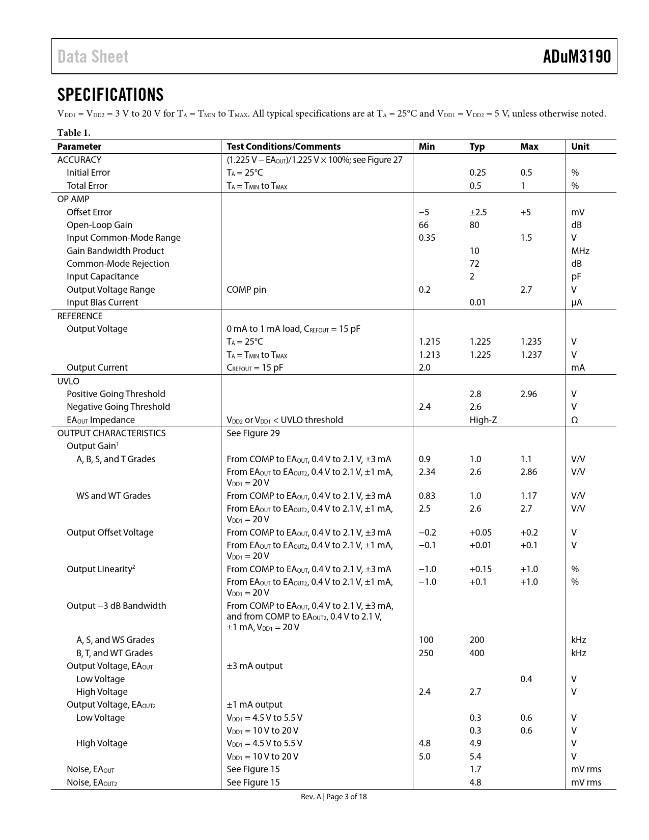 ACCURACY (1.225 V − EAOUT)/1.225 V × 100%; see Figure 27 Initial Error TA = 25°C 0.25 0.5 % Total Error TA = TMIN to TMAX 0.5 1 % OP AMP Offset Error −5 ±2.5 +5 mV Open-Loop Gain 66 80 dB Input Common-Mode Range 0.35 1.5 V Gain Bandwidth Product 10 MHz Common-Mode Rejection 72 dB Input Capacitance 2 pF Output Voltage Range COMP pin 0.2 2.7 V Input Bias Current 0.01 µA REFERENCE Output Voltage 0 mA to 1 mA load, CREFOUT = 15 pF TA = 25°C 1.215 1.225 1.235 V TA = TMIN to TMAX 1.213 1.225 1.237 V Output Current CREFOUT = 15 pF 2.0 mA UVLO Positive Going Threshold 2.8 2.96 V Negative Going Threshold 2.4 2.6 V EAOUT Impedance VDD2 or VDD1 < UVLO threshold High-Z Ω OUTPUT CHARACTERISTICS See Figure 29 Output Gain1 A, B, S, and T Grades From COMP to EAOUT, 0.4 V to 2.1 V, ±3 mA 0.9 1.0 1.1 V/V From EAOUT to EAOUT2, 0.4 V to 2.1 V, ±1 mA, 2.34 2.6 2.86 V/V VDD1 = 20 V WS and WT Grades From COMP to EAOUT, 0.4 V to 2.1 V, ±3 mA 0.83 1.0 1.17 V/V From EAOUT to EAOUT2, 0.4 V to 2.1 V, ±1 mA, 2.5 2.6 2.7 V/V VDD1 = 20 V Output Offset Voltage From COMP to EAOUT, 0.4 V to 2.1 V, ±3 mA −0.2 +0.05 +0.2 V From EAOUT to EAOUT2, 0.4 V to 2.1 V, ±1 mA, −0.1 +0.01 +0.1 V VDD1 = 20 V Output Linearity2 From COMP to EAOUT, 0.4 V to 2.1 V, ±3 mA −1.0 +0.15 +1.0 % From EAOUT to EAOUT2, 0.4 V to 2.1 V, ±1 mA, −1.0 +0.1 +1.0 % VDD1 = 20 V Output −3 dB Bandwidth From COMP to EAOUT, 0.4 V to 2.1 V, ±3 mA, and from COMP to EAOUT2, 0.4 V to 2.1 V, ±1 mA, VDD1 = 20 V A, S, and WS Grades 100 200 kHz B, T, and WT Grades 250 400 kHz Output Voltage, EAOUT ±3 mA output Low Voltage 0.4 V High Voltage 2.4 2.7 V Output Voltage, EAOUT2 ±1 mA output Low Voltage VDD1 = 4.5 V to 5.5 V 0.3 0.6 V VDD1 = 10 V to 20 V 0.3 0.6 V High Voltage VDD1 = 4.5 V to 5.5 V 4.8 4.9 V VDD1 = 10 V to 20 V 5.0 5.4 V Noise, EAOUT See Figure 15 1.7 mV rms Noise, EAOUT2 See Figure 15 4.8 mV rms Rev. A | Page 3 of 18 Document Outline Features Applications General Description Functional Block Diagram Table of Contents Revision History Specifications Package Characteristics Regulatory Information Insulation and Safety Related Specifications Recommended Operating Conditions DIN V VDE V 0884-10 (VDE V 0884-10) Insulation Characteristics Absolute Maximum Ratings ESD Caution Pin Configuration and Function Descriptions Typical Performance Characteristics Test Circuits Applications Information Theory of Operation Accuracy Circuit Operation Isolated Amplifier Circuit Operation Application Block Diagram Setting the Output Voltage DOSA Module Application DC Correctness and Magnetic Field Immunity Insulation Lifetime Packaging and Ordering Information Outline Dimensions Ordering Guide Automotive Products