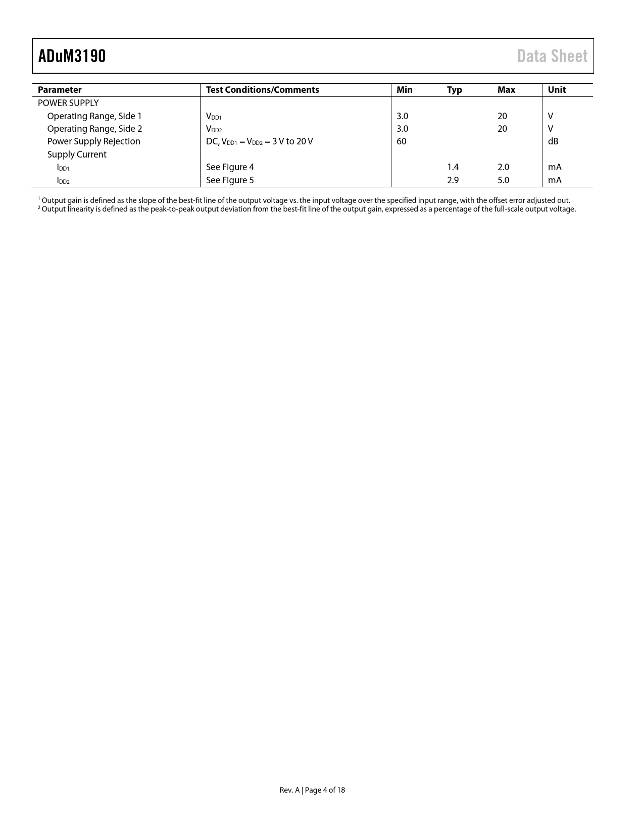 POWER SUPPLY Operating Range, Side 1 VDD1 3.0 20 V Operating Range, Side 2 VDD2 3.0 20 V Power Supply Rejection DC, VDD1 = VDD2 = 3 V to 20 V 60 dB Supply Current IDD1 See Figure 4 1.4 2.0 mA IDD2 See Figure 5 2.9 5.0 mA 1 Output gain is defined as the slope of the best-fit line of the output voltage vs. the input voltage over the specified input range, with the offset error adjusted out. 2 Output linearity is defined as the peak-to-peak output deviation from the best-fit line of the output gain, expressed as a percentage of the full-scale output voltage. Rev. A | Page 4 of 18 Document Outline Features Applications General Description Functional Block Diagram Table of Contents Revision History Specifications Package Characteristics Regulatory Information Insulation and Safety Related Specifications Recommended Operating Conditions DIN V VDE V 0884-10 (VDE V 0884-10) Insulation Characteristics Absolute Maximum Ratings ESD Caution Pin Configuration and Function Descriptions Typical Performance Characteristics Test Circuits Applications Information Theory of Operation Accuracy Circuit Operation Isolated Amplifier Circuit Operation Application Block Diagram Setting the Output Voltage DOSA Module Application DC Correctness and Magnetic Field Immunity Insulation Lifetime Packaging and Ordering Information Outline Dimensions Ordering Guide Automotive Products