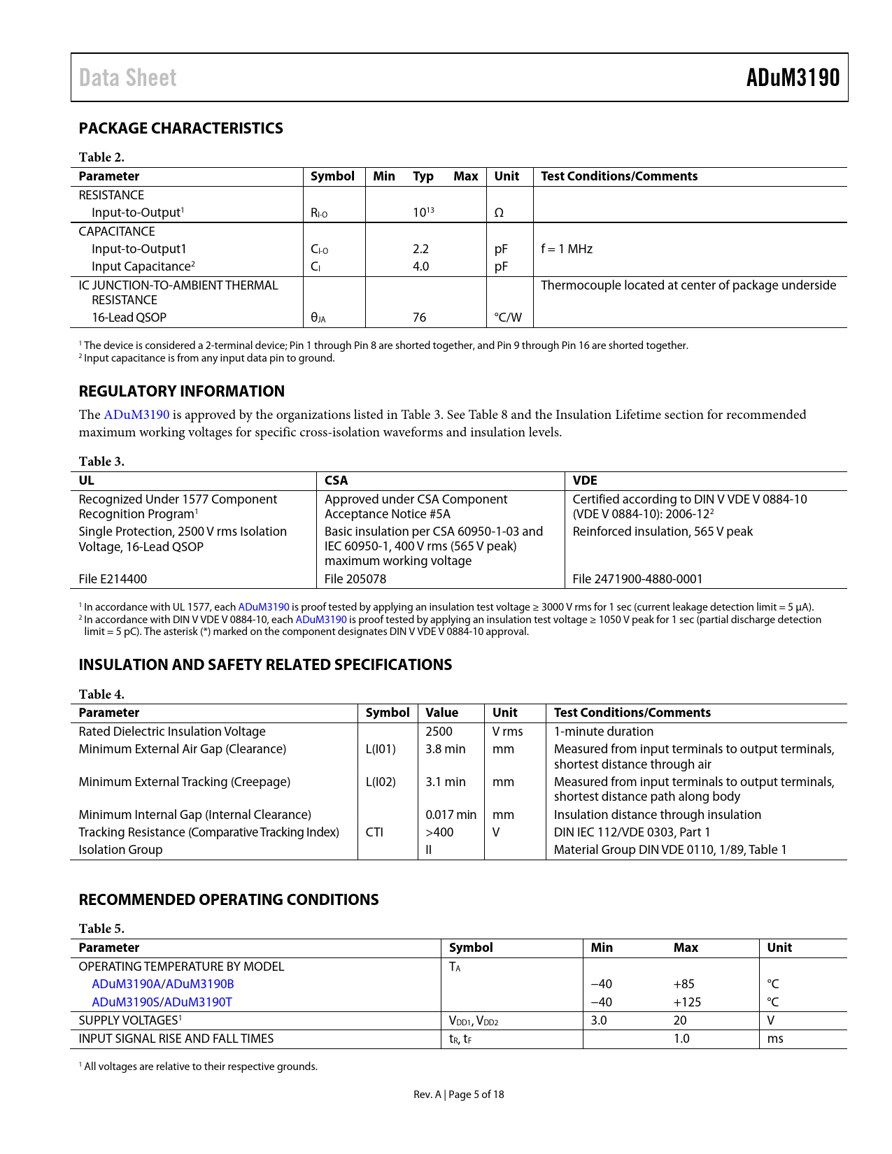 Data Sheet ADuM3190 PACKAGE CHARACTERISTICS Table 2. Parameter Symbol Min Typ Max Unit Test Conditions/Comments
