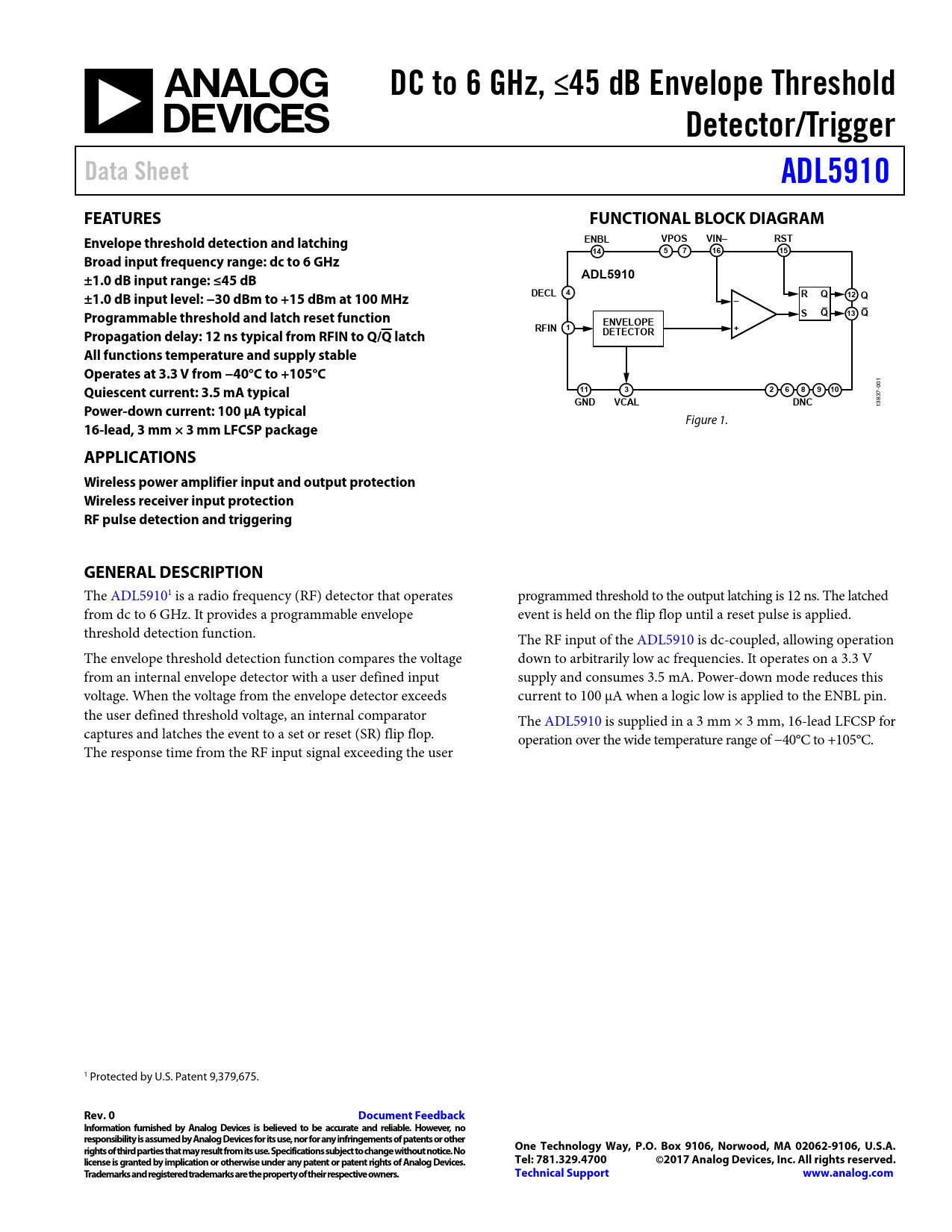 The ADL59101 is a radio frequency (RF) detector that operates programmed threshold to the output latching is 12 ns. The latched from dc to 6 GHz. It provides a programmable envelope event is held on the flip flop until a reset pulse is applied. threshold detection function. The RF input of the ADL5910 is dc-coupled, allowing operation The envelope threshold detection function compares the voltage down to arbitrarily low ac frequencies. It operates on a 3.3 V from an internal envelope detector with a user defined input supply and consumes 3.5 mA. Power-down mode reduces this voltage. When the voltage from the envelope detector exceeds current to 100 μA when a logic low is applied to the ENBL pin. the user defined threshold voltage, an internal comparator The ADL5910 is supplied in a 3 mm × 3 mm, 16-lead LFCSP for captures and latches the event to a set or reset (SR) flip flop. operation over the wide temperature range of −40°C to +105°C. The response time from the RF input signal exceeding the user 1 Protected by U.S. Patent 9,379,675.