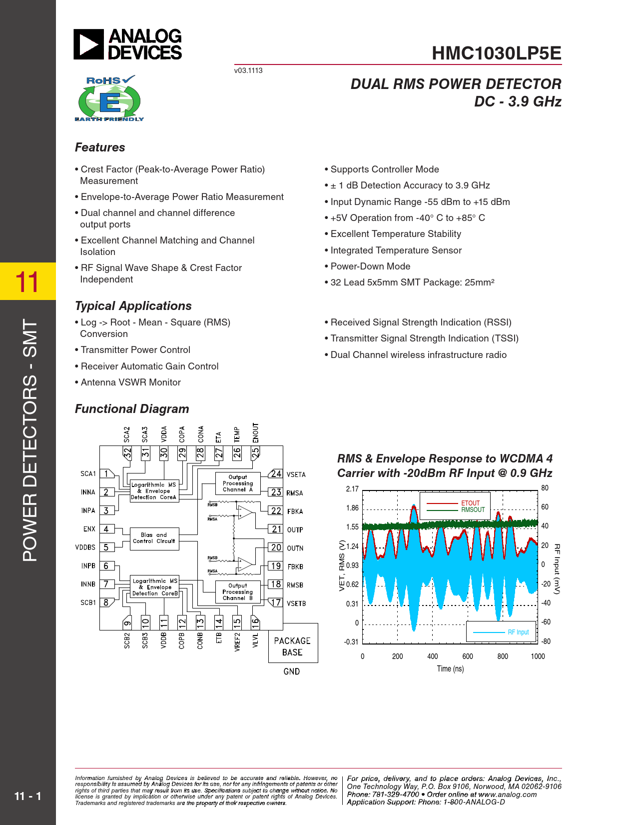 HMC1030LP5E v03.1113 DUAL RMS POWER DETECTORDC - 3.9 GHzFeatures • Crest Factor (Peak-to-Average Power Ratio) • Supports Controller Mode Measurement • ± 1 dB Detection Accuracy to 3.9 GHz • Envelope-to-Average Power Ratio Measurement • Input Dynamic Range -55 dBm to +15 dBm • Dual channel and channel difference • +5V Operation from -40° C to +85° C output ports • Excellent Temperature Stability • Excellent Channel Matching and Channel Isolation • Integrated Temperature Sensor 11 • RF Signal Wave Shape & Crest Factor • Power-Down Mode Independent • 32 Lead 5x5mm SMT Package: 25mm² Typical Applications T • Log -> Root - Mean - Square (RMS) • Received Signal Strength Indication (RSSI) M Conversion • Transmitter Signal Strength Indication (TSSI) S • Transmitter Power Control • Dual Channel wireless infrastructure radio - • Receiver Automatic Gain Control • Antenna VSWR Monitor RS O T Functional Diagram C TE E RMS & Envelope Response to WCDMA 4 Carrier with -20dBm RF Input @ 0.9 GHz D 2.17 80 R ETOUT 1.86 60 RMSOUT WE 1.55 40 O ) RF Input (mV) V 20 P 1.24 ( S M 0.93 0 , R T E 0.62 -20 V 0.31 -40 0 -60 RF Input -0.31 -80 0 200 400 600 800 1000 Time (ns) Info F rmoatr p ion rfiurcne is , d hed ebly ivAe n r al y a og D n evd t ice o p s is bla eli c eve o ed t rd o b e e ras: H ccuratite tiatne M d reli iac bl reo . w Ho av wev e C er, n o o For price, delivery, and to place orders: Analog Devices, Inc., responsibility is assumed by Analog Devices for its use, nor for any infringements of patents or other rporation, 20 Alpha Road, Chelmsford, MA 01824 One Technology Way, P.O. Box 9106, Norwood, MA 02062-9106 11 - 1 Phone: 978-250-3343 Fax: 978-250-3373 O rights of third parties that may result from its use. Specifications subject to change without notice. No P rd hone e r O : 7 n 81- -3li 2n 9 e a -47 t w 0 w 0 • O w rd .h e it r o t niltie n .c e ao t m license is granted by implication or otherwise under any patent or patent rights of Analog Devices. www.analog.com Application Support: Pho Trademarks and registered trademarks are the property of their respective owners. ne: 978-250-33 A 4 p 3 p o lica rti a o p n S p u s p @ po h rt itt : P ite ho . n c e om : 1-800-ANALOG-D