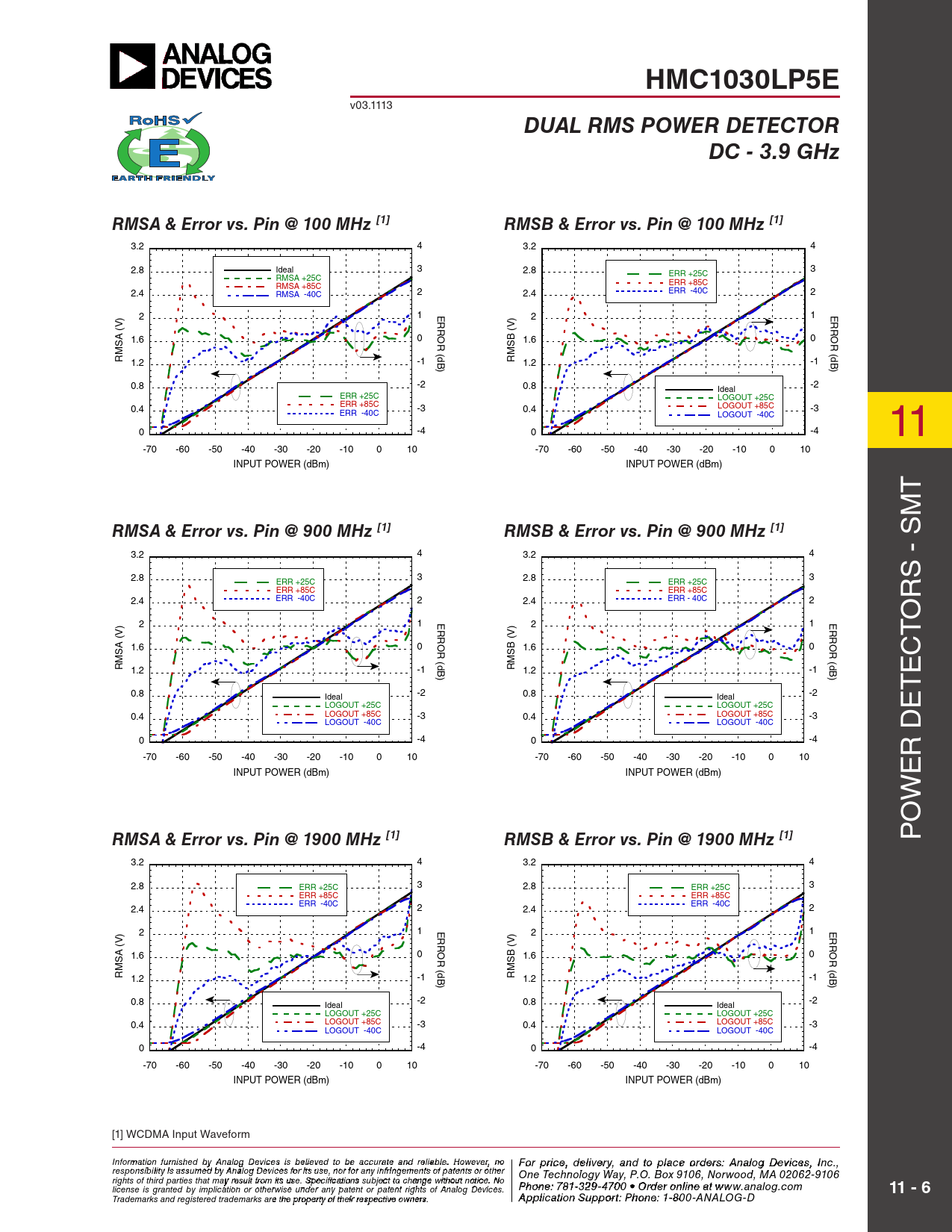 HMC1030LP5E DUAL RMS POWER DETECTOR DC - 3.9 GHz RMSA & Error vs Pin @ 100 MHz [1]