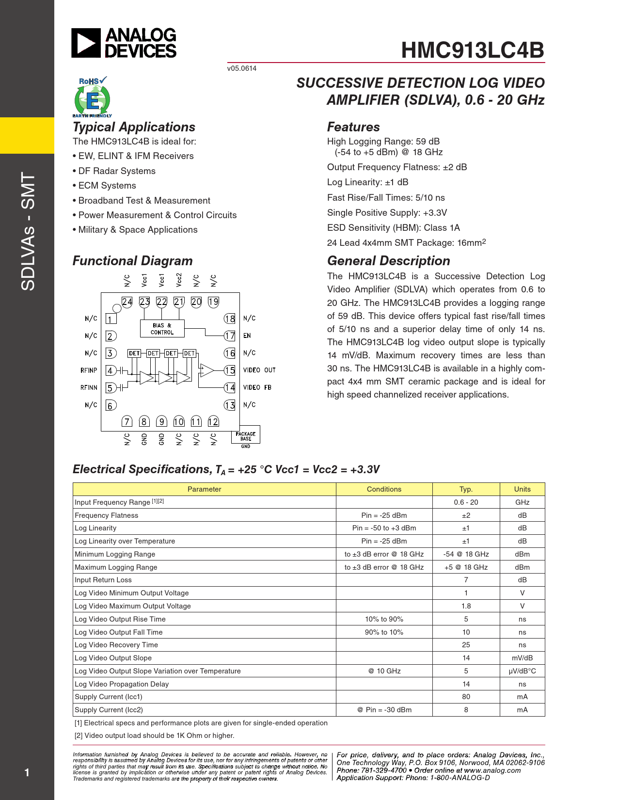 SD The HMC913LC4B is a Successive Detection Log Video Amplifier (SDLVA) which operates from 0.6 to 20 GHz. The HMC913LC4B provides a logging range of 59 dB. This device offers typical fast rise/fall times of 5/10 ns and a superior delay time of only 14 ns. The HMC913LC4B log video output slope is typical y 14 mV/dB. Maximum recovery times are less than 30 ns. The HMC913LC4B is available in a highly com- pact 4x4 mm SMT ceramic package and is ideal for high speed channelized receiver applications.