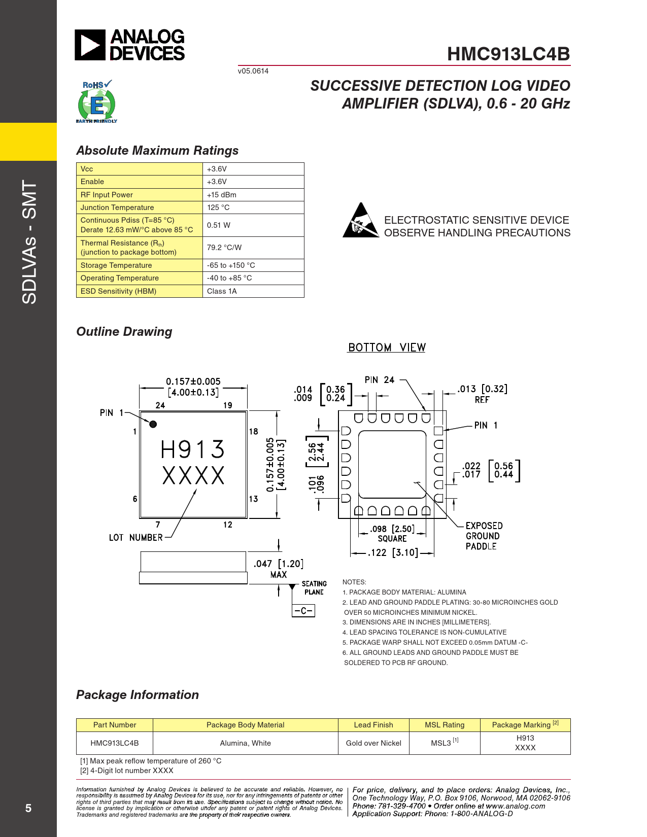 HMC913LC4B. SUCCESSIVE DETECTION LOG VIDEO. AMPLIFIER (SDLVA), 0.6 - 20 GHz. Absolute Maximum Ratings. Outline Drawing