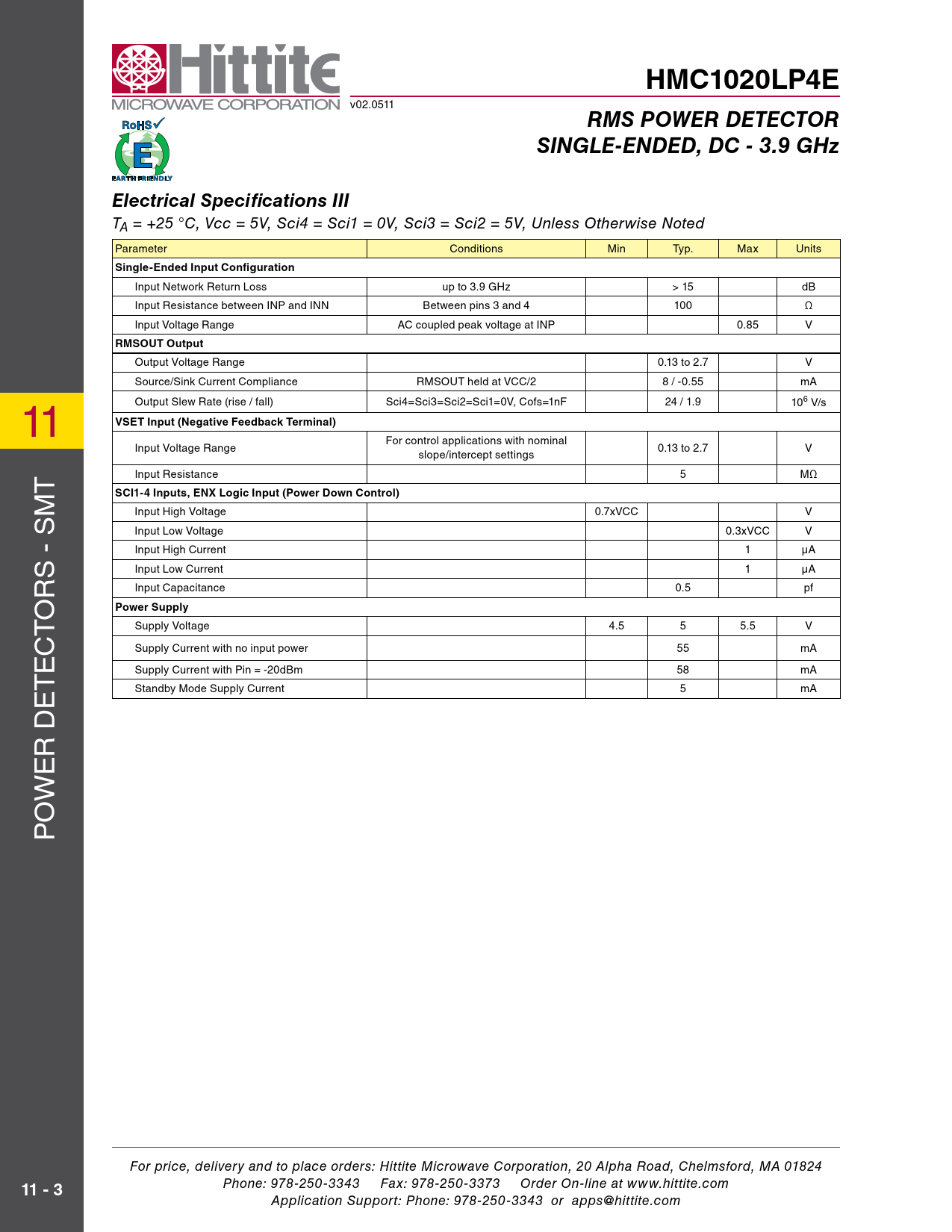 Application Support: Phone: 978-250-3343 or apps@hittite.com Document Outline Typical Applications Features Functional Diagram General Descriptions Electrical Specifications I Electrical Specifications II RMSOUT vs. Pin with Different Modulations @ 1900 MHz RMSOUT Error vs. Pin with Different Modulations @ 1900 MHz Electrical Specifications III Typical Performance Characteristics RMSOUT & Error vs. Pin @ 100 MHz RMSOUT & Error vs. Pin @ 900 MHz RMSOUT & Error vs. Pin @ 1900 MHz RMSOUT & Error vs. Pin @ 2200 MHz RMSOUT & Error vs. Pin @ 2700 MHz RMSOUT & Error vs. Pin @ 3500 MHz RMSOUT & Error vs. Pin @ 3900 MHz Intercept vs. Frequency Slope vs. Frequency RMSOUT vs. Pin with WCDMA 4 Carrier @ +25 °C RMSOUT Error vs. Pin with WCDMA 4 Carrier @ +25 °C RMSOUT Error vs. Pin with WCDMA 4 Carrier @ +85 °C wrt +25 °C Response RMSOUT Error vs. Pin with WCDMA 4 Carrier @ -40 °C wrt +25 °C Response RMSOUT vs. Pin with CW @ +25 °C RMSOUT Error vs. Pin with CW @ +25 °C RMSOUT vs. Pin w/ CW & WCDMA 4 Carrier @ 1900 MHz & +25 °C Reading Error for WCDMA 4 Carrier wrt CW Response @ +25 °C RMSOUT vs. Pin w/ CW & WCDMA 4 Carrier @ 1900 MHz & +85 °C Reading Error for WCDMA 4 Carrier wrt CW Response @ +85 °C RMSOUT vs. Pin w/ CW & WCDMA 4 Carrier @ 1900 MHz & -40 °C Reading Error for WCDMA 4 Carrier wrt CW Response @ -40 °C Output Response with SCI = 0000 @ 1900 MHz Output Response with SCI = 1100 @ 1900 MHz Typical Supply Current vs. Pin, Vcc = 5V Input Return Loss vs. Frequency Output Ripple & Rise/Fall Time vs. Integration Setting [Sci4,Sci3,Sci2,Sci1] in Decimal Absolute Maximum Ratings Outline Drawing Package Information Pin Descriptions Evaluation PCB List of Materials Evaluation Order Information Application Circuit Application Information Principle of Operation Configuration For The Typical Application Broadband Single-Ended Input Interface RMSOUT & Error vs. Pin RMS Output Interface and Transient Response Table 1: Transient Response vs. SCI Setting Rise Time vs. SCI Setting over Input Power Rise Settling Time vs. SCI Setting over Input Power Fall Time vs. SCI Setting over Input Power Residual Ripple for 900 Mhz WiMAX @ SCI=0100 Residual Ripple for 900 Mhz WiMAX @ SCI=0110 Residual Ripple for 900 Mhz WiBRO @ SCI=0100 Residual Ripple for 900 Mhz WiBRO @ SCI=0110 Residual Ripple for 900 Mhz LTE Downlink @ SCI=0100 Residual Ripple for 900 Mhz LTE Downlink @ SCI=0110 Residual Ripple for 900 Mhz WCDMA4 @ SCI=0011 Residual Ripple for 900 Mhz WCDMA4 @ SCI=0100 LOG-Slope and Intercept Slope Adjustment Intercept Adjustment DC Offset Compensation Loop Standby Mode Modulation Performance - Crest factor performance Reading Error for WCDMA 4 Carrier wrt CW Response @ +25 °C Reading Error for WCDMA 4 Carrier wrt CW Response @ 2200MHz RMSOUT Error vs. Crest Factor over Frequency System Calibration Layout Considerations Definitions