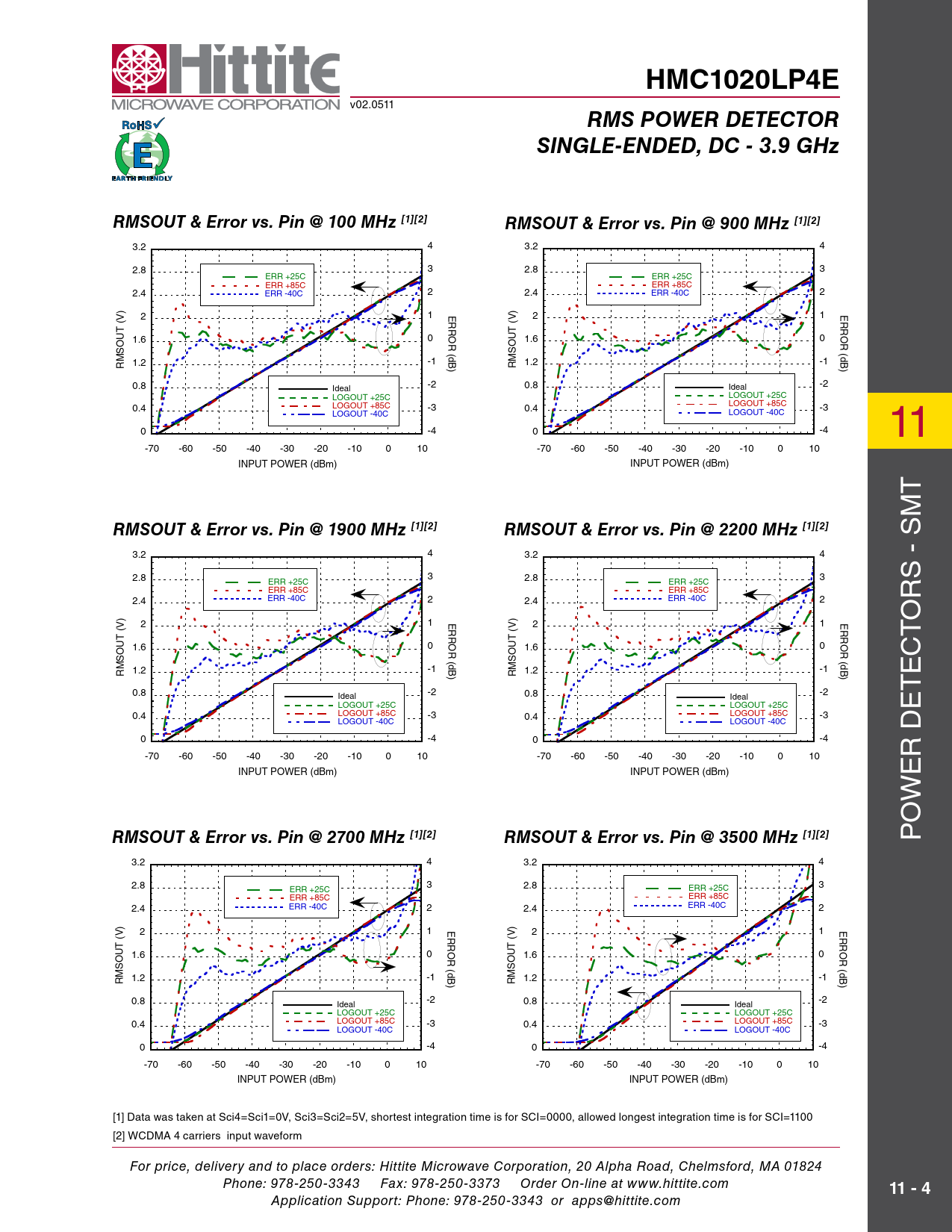 Application Support: Phone: 978-250-3343 or apps@hittite.com Document Outline Typical Applications Features Functional Diagram General Descriptions Electrical Specifications I Electrical Specifications II RMSOUT vs. Pin with Different Modulations @ 1900 MHz RMSOUT Error vs. Pin with Different Modulations @ 1900 MHz Electrical Specifications III Typical Performance Characteristics RMSOUT & Error vs. Pin @ 100 MHz RMSOUT & Error vs. Pin @ 900 MHz RMSOUT & Error vs. Pin @ 1900 MHz RMSOUT & Error vs. Pin @ 2200 MHz RMSOUT & Error vs. Pin @ 2700 MHz RMSOUT & Error vs. Pin @ 3500 MHz RMSOUT & Error vs. Pin @ 3900 MHz Intercept vs. Frequency Slope vs. Frequency RMSOUT vs. Pin with WCDMA 4 Carrier @ +25 °C RMSOUT Error vs. Pin with WCDMA 4 Carrier @ +25 °C RMSOUT Error vs. Pin with WCDMA 4 Carrier @ +85 °C wrt +25 °C Response RMSOUT Error vs. Pin with WCDMA 4 Carrier @ -40 °C wrt +25 °C Response RMSOUT vs. Pin with CW @ +25 °C RMSOUT Error vs. Pin with CW @ +25 °C RMSOUT vs. Pin w/ CW & WCDMA 4 Carrier @ 1900 MHz & +25 °C Reading Error for WCDMA 4 Carrier wrt CW Response @ +25 °C RMSOUT vs. Pin w/ CW & WCDMA 4 Carrier @ 1900 MHz & +85 °C Reading Error for WCDMA 4 Carrier wrt CW Response @ +85 °C RMSOUT vs. Pin w/ CW & WCDMA 4 Carrier @ 1900 MHz & -40 °C Reading Error for WCDMA 4 Carrier wrt CW Response @ -40 °C Output Response with SCI = 0000 @ 1900 MHz Output Response with SCI = 1100 @ 1900 MHz Typical Supply Current vs. Pin, Vcc = 5V Input Return Loss vs. Frequency Output Ripple & Rise/Fall Time vs. Integration Setting [Sci4,Sci3,Sci2,Sci1] in Decimal Absolute Maximum Ratings Outline Drawing Package Information Pin Descriptions Evaluation PCB List of Materials Evaluation Order Information Application Circuit Application Information Principle of Operation Configuration For The Typical Application Broadband Single-Ended Input Interface RMSOUT & Error vs. Pin RMS Output Interface and Transient Response Table 1: Transient Response vs. SCI Setting Rise Time vs. SCI Setting over Input Power Rise Settling Time vs. SCI Setting over Input Power Fall Time vs. SCI Setting over Input Power Residual Ripple for 900 Mhz WiMAX @ SCI=0100 Residual Ripple for 900 Mhz WiMAX @ SCI=0110 Residual Ripple for 900 Mhz WiBRO @ SCI=0100 Residual Ripple for 900 Mhz WiBRO @ SCI=0110 Residual Ripple for 900 Mhz LTE Downlink @ SCI=0100 Residual Ripple for 900 Mhz LTE Downlink @ SCI=0110 Residual Ripple for 900 Mhz WCDMA4 @ SCI=0011 Residual Ripple for 900 Mhz WCDMA4 @ SCI=0100 LOG-Slope and Intercept Slope Adjustment Intercept Adjustment DC Offset Compensation Loop Standby Mode Modulation Performance - Crest factor performance Reading Error for WCDMA 4 Carrier wrt CW Response @ +25 °C Reading Error for WCDMA 4 Carrier wrt CW Response @ 2200MHz RMSOUT Error vs. Crest Factor over Frequency System Calibration Layout Considerations Definitions