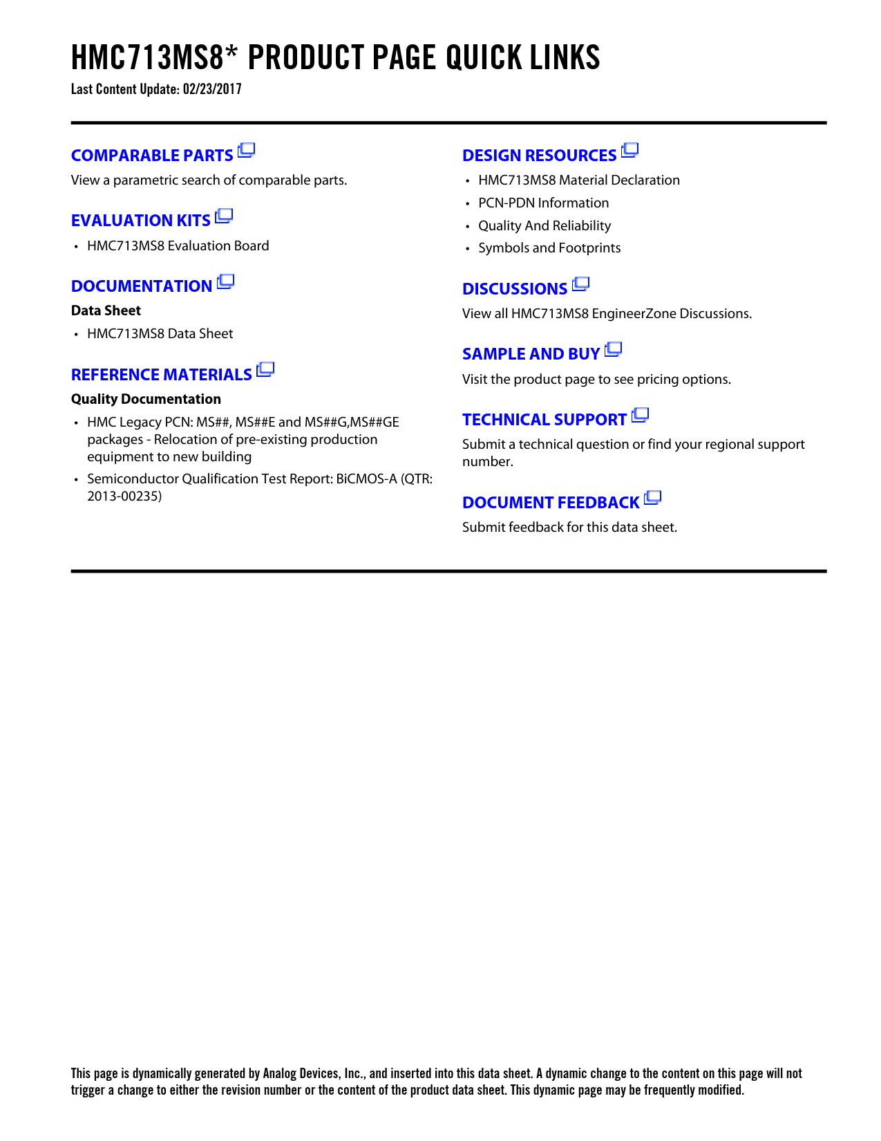 HMC713MS8* PRODUCT PAGE QUICK LINKS Last Content Update: 02/23/2017. COMPARABLE PARTS. DESIGN RESOURCES. EVALUATION KITS