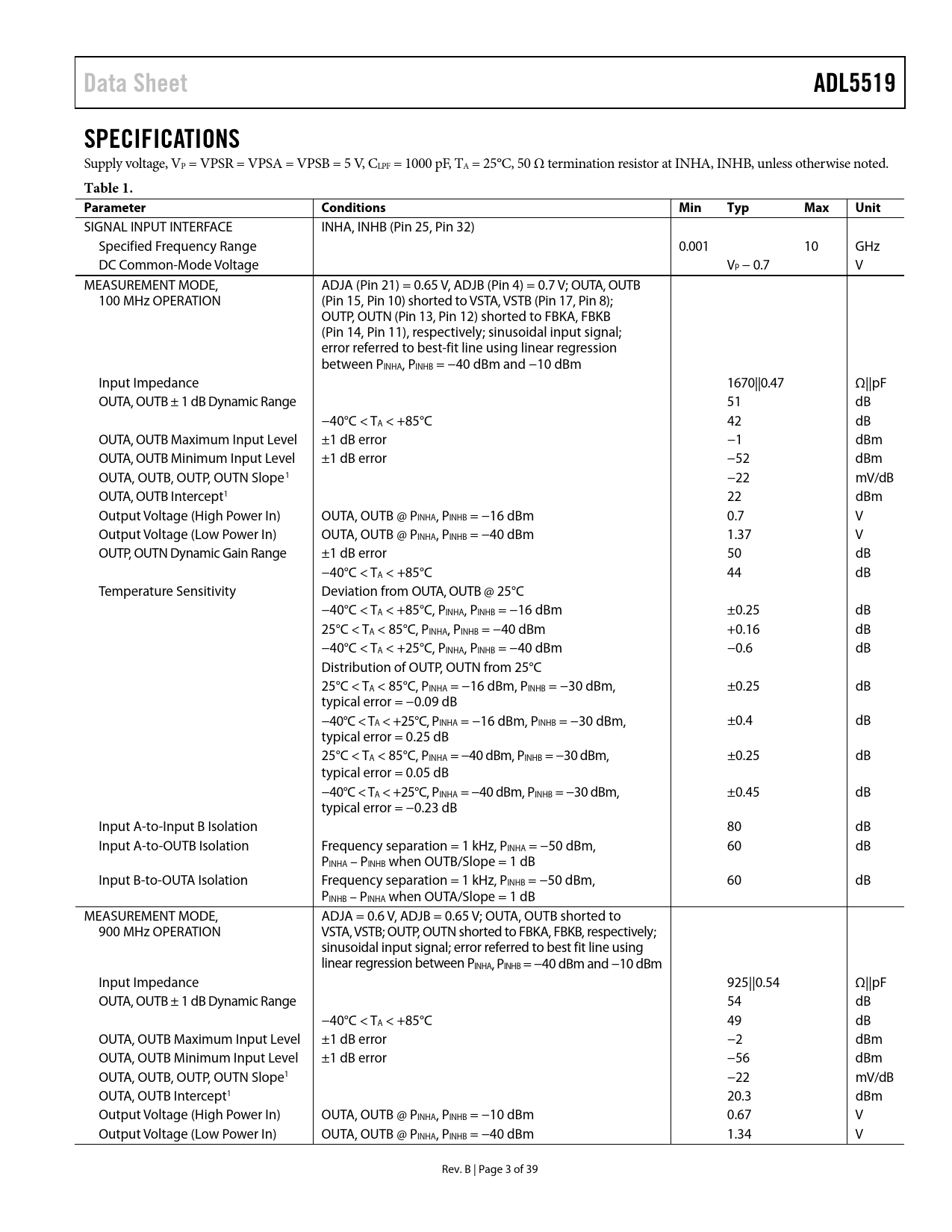 | 页数 / 页 | 39 / 3 — Data Sheet. ADL5519. SPECIFICATIONS. Table 1. Parameter. Conditions. Min. … |