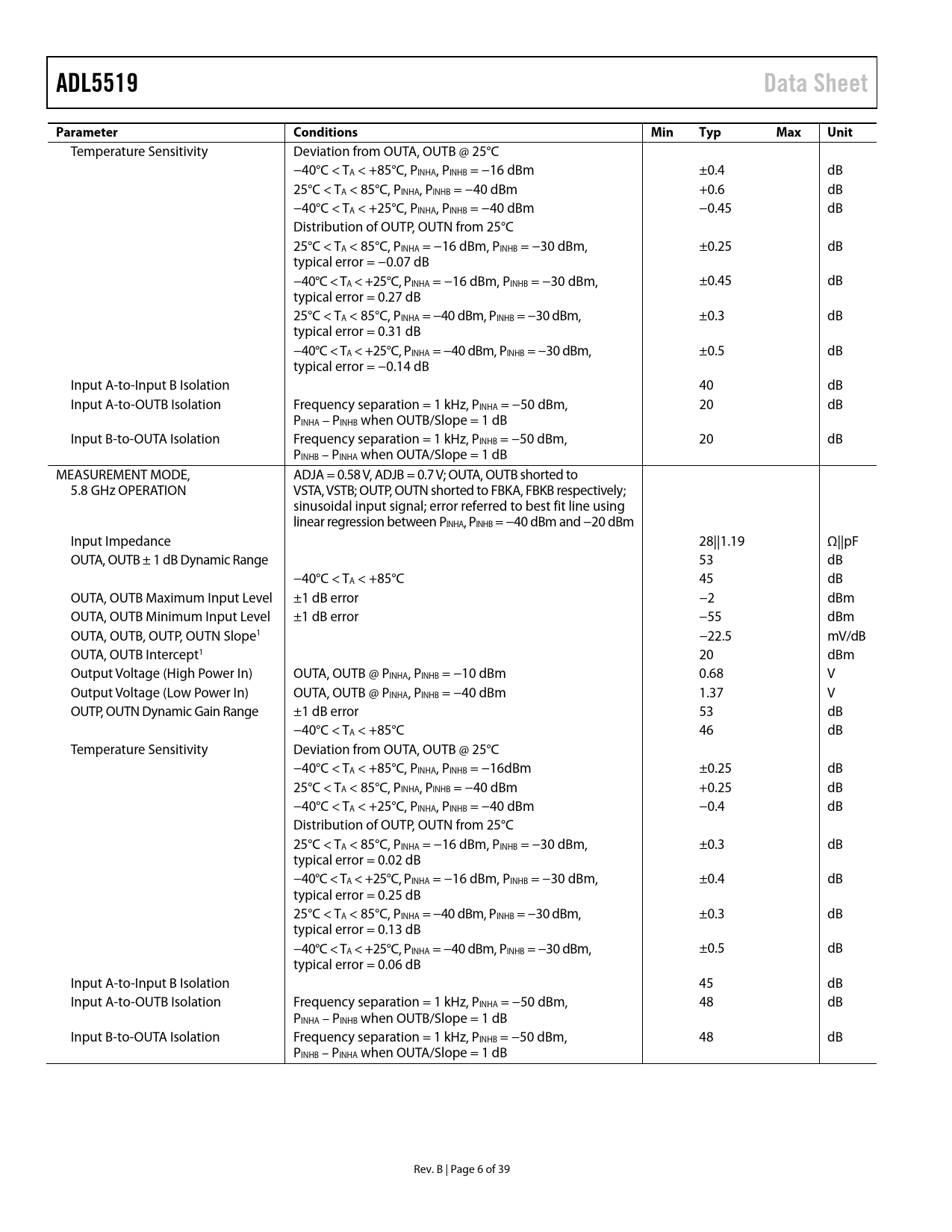 页数 / 页39 / 6 — ADL5519. Data Sheet. Parameter. Conditions. Min. Typ. Max. Unit