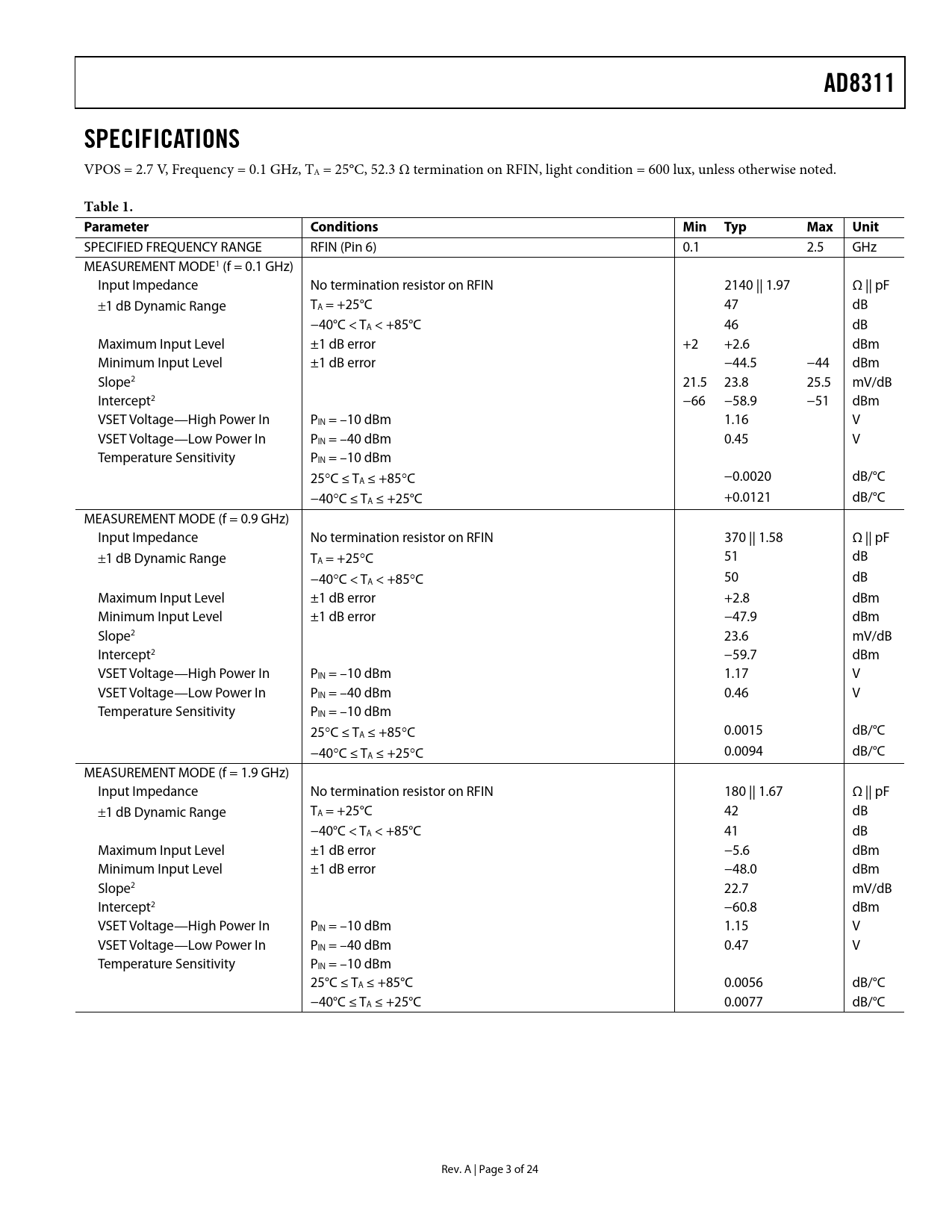 AD8311. SPECIFICATIONS. Table 1. Parameter. Conditions. Min. Typ. Max. Unit