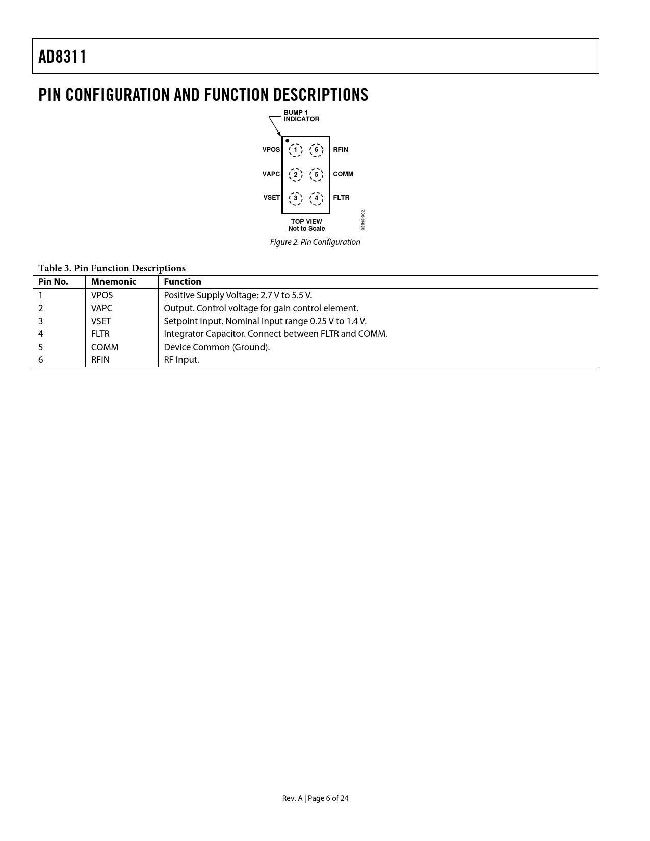 AD8311 PIN CONFIGURATION AND FUNCTION DESCRIPTIONS BUMP 1 INDICATOR VPOS 1 6 RFIN VAPC 2 5 COMM VSET 3 4 FLTR TOP VIEW Not to Scale