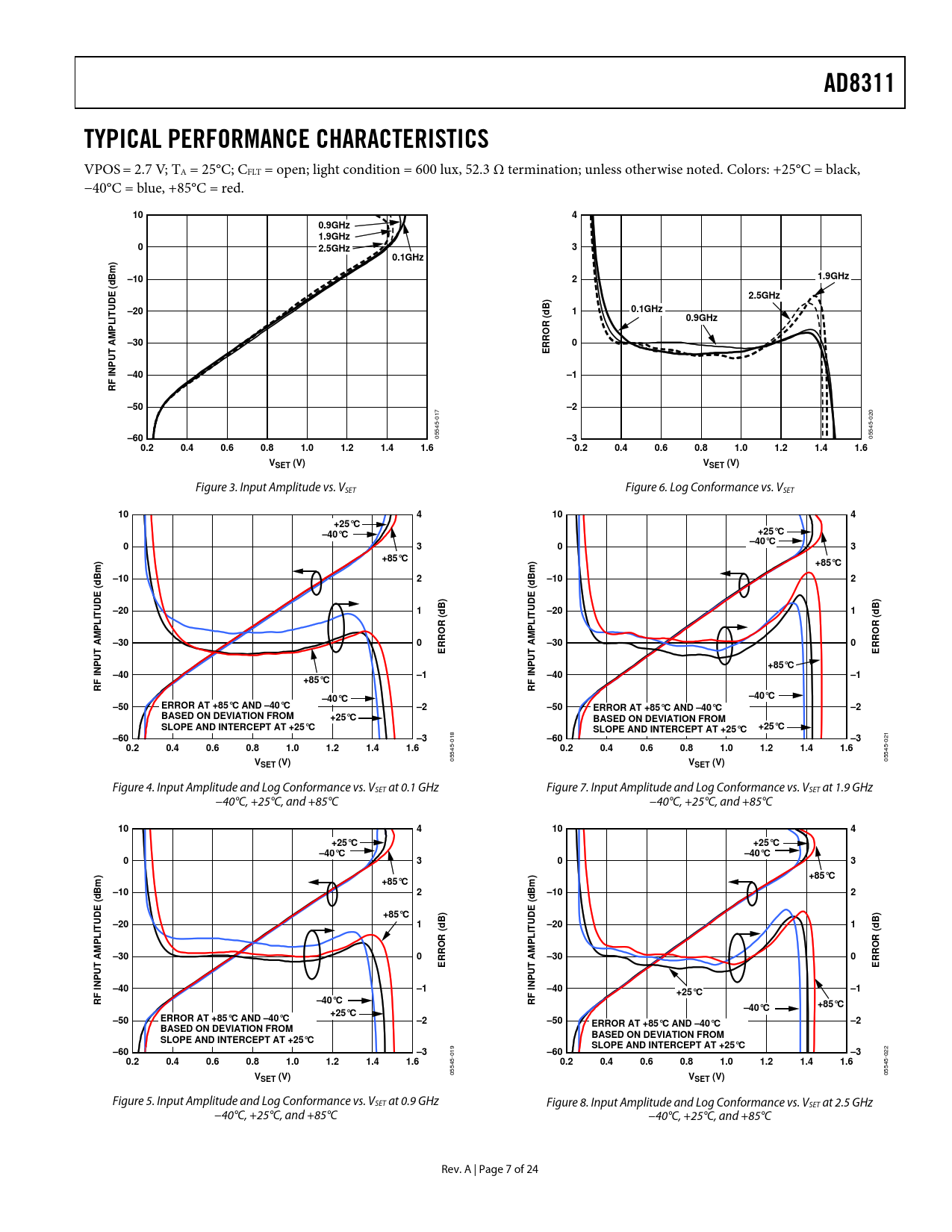 Figure 4. Input Amplitude and Log Conformance vs. VSET at 0.1 GHz Figure 7. Input Amplitude and Log Conformance vs. VSET at 1.9 GHz −40°C, +25°C, and +85°C −40°C, +25°C, and +85°C