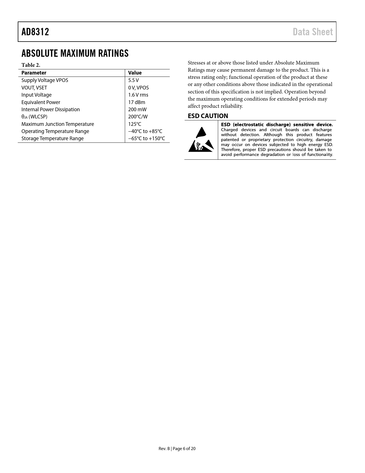 AD8312Data SheetABSOLUTE MAXIMUM RATINGS Table 2. Stresses at or above those listed under Absolute Maximum ParameterValue Ratings may cause permanent damage to the product. This is a Supply Voltage VPOS 5.5 V stress rating only; functional operation of the product at these or any other conditions above those indicated in the operational VOUT, VSET 0 V, VPOS section of this specification is not implied. Operation beyond Input Voltage 1.6 V rms the maximum operating conditions for extended periods may Equivalent Power 17 dBm affect product reliability. Internal Power Dissipation 200 mW θJA (WLCSP) 200°C/W ESD CAUTION Maximum Junction Temperature 125°C Operating Temperature Range −40°C to +85°C Storage Temperature Range −65°C to +150°C Rev. B | Page 6 of 20 Document Outline FEATURES APPLICATIONS GENERAL DESCRIPTION FUNCTIONAL BLOCK DIAGRAM REVISION HISTORY SPECIFICATIONS ABSOLUTE MAXIMUM RATINGS ESD CAUTION PIN CONFIGURATION AND FUNCTION DESCRIPTIONS TYPICAL PERFORMANCE CHARACTERISTICS GENERAL DESCRIPTION APPLICATIONS INFORMATION BASIC CONNECTIONS TRANSFER FUNCTION IN TERMS OF SLOPE AND INTERCEPT Filter Capacitor Input Coupling Options Increasing the Logarithmic Slope Effect of Waveform Type on Intercept Temperature Drift Operation Above 2.5 GHz Device Handling Evaluation Board OUTLINE DIMENSIONS ORDERING GUIDE