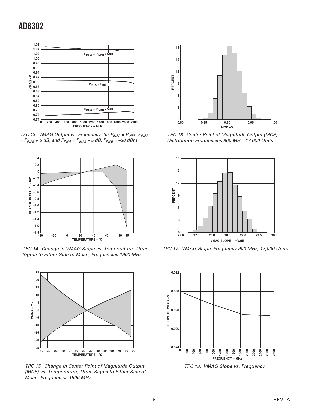 AD83021.06181.041.02PINPA = PINPB + 5dB1.00150.980.960.9412V – 0.92 G 0.90P9INPA = PINPB0.88VMAPERCENT0.860.8460.820.8030.78PINPA = PINPB – 5dB0.760.7400200400600800 1000 1200 1400 1600 1800 2000 22000.800.850.900.951.00FREQUENCY – MHzMCP – V TPC 13. VMAG Output vs. Frequency, for PINPA = PINPB, PINPA TPC 16. Center Point of Magnitude Output (MCP) = PINPB + 5 dB, and PINPA = PINPB – 5 dB, PINPB = –30 dBm Distribution Frequencies 900 MHz, 17,000 Units 0.4180.2015–0.2mV –12–0.4–0.69–0.8PERCENT–1.06CHANGE IN SLOPE –1.2–1.43–1.6–1.80–40–200204060808527.027.528.028.529.029.530.0TEMPERATURE – ⴗ CVMAG SLOPE – mV/dB TPC 14. Change in VMAG Slope vs. Temperature, Three TPC 17. VMAG Slope, Frequency 900 MHz, 17,000 Units Sigma to Either Side of Mean, Frequencies 1900 MHz 250.03220150.03010V –5GmV –VMAG00.028VMA –5–10SLOPE OF0.026–15–20–250.024–40 –30 –20 –1001020304050607080900200400600800TEMPERATURE – ⴗ C1000120014001600180020002200240026002800FREQUENCY – MHz TPC 15. Change in Center Point of Magnitude Output TPC 18. VMAG Slope vs. Frequency (MCP) vs. Temperature, Three Sigma to Either Side of Mean, Frequencies 1900 MHz –8– REV. A Document Outline FEATURES PRODUCT DESCRIPTION FUNCTIONAL BLOCK DIAGRAM SPECIFICATIONS ABSOLUTE MAXIMUM RATINGS PIN CONFIGURATION PIN FUNCTION DESCRIPTIONS ORDERING GUIDE CAUTION Equivalent Circuits Typical Performance Characteristics GENERAL DESCRIPTION AND THEORY Basic Theory Structure BASIC CONNECTIONS Measurement Mode Interfacing to the Input Channels Dynamic Range Cross Modulation of Magnitude and Phase Modifying the Slope and Center Point Comparator and Controller Modes APPLICATIONS Measuring Amplifier Gain and Compression CHARACTERIZATION SETUPS AND METHODS Gain Phase OUTLINE DIMENSIONS