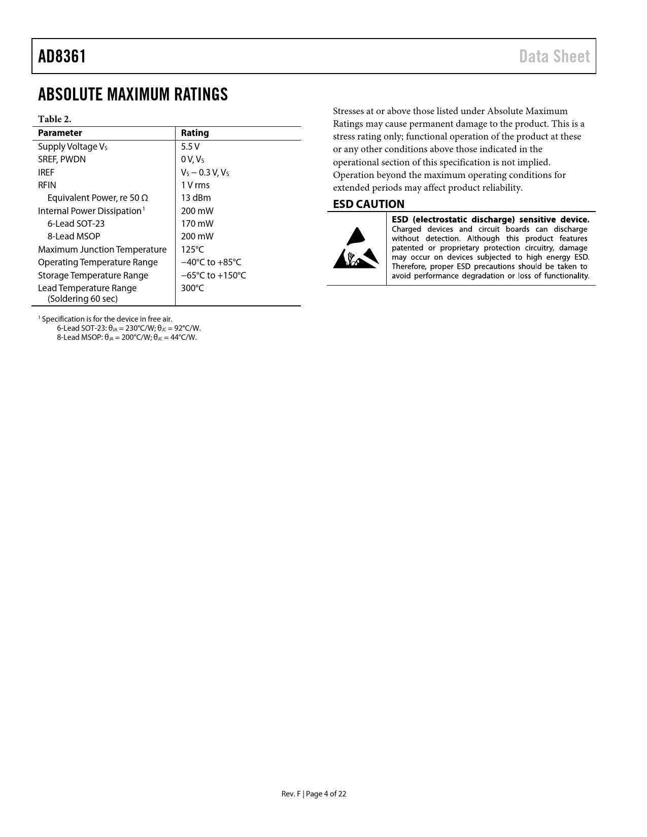 AD8361. Data Sheet. ABSOLUTE MAXIMUM RATINGS. Table 2. Parameter. Rating. ESD CAUTION