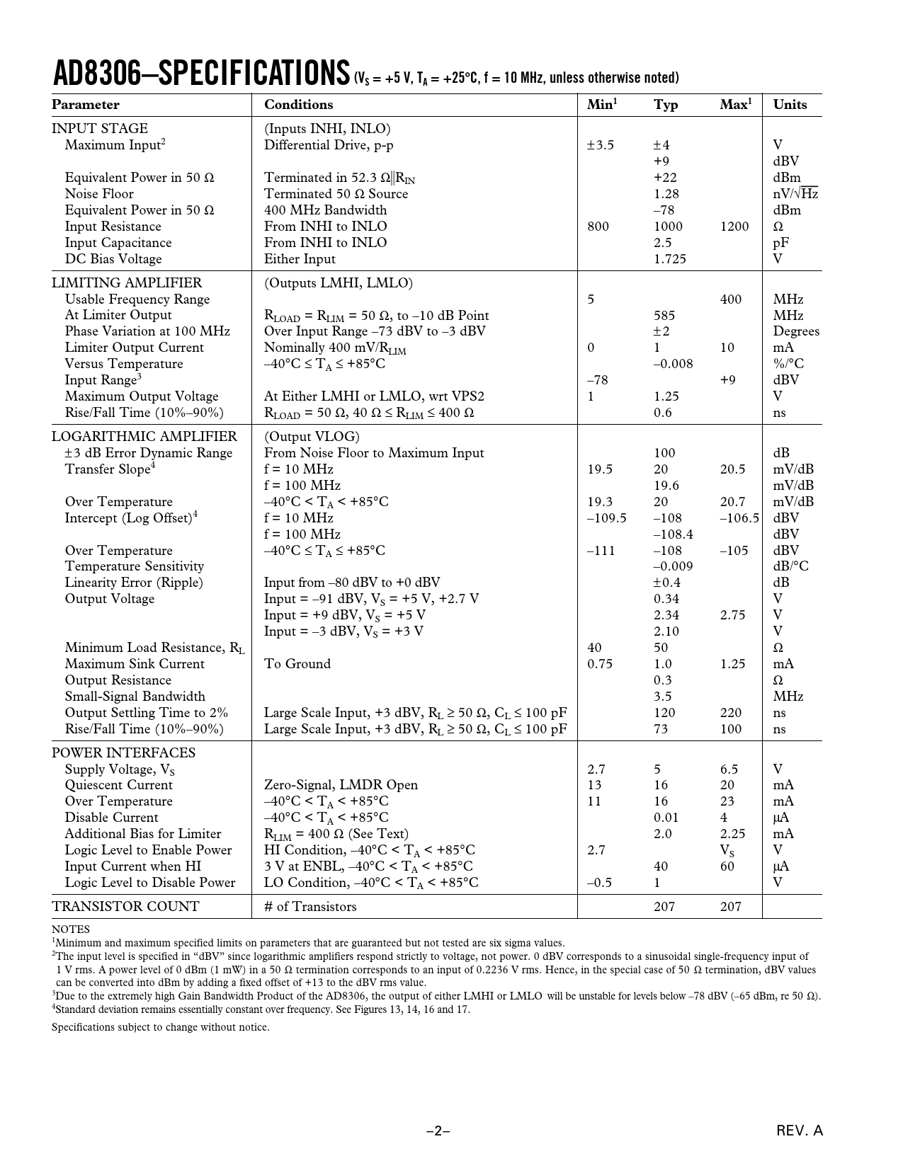 AD8306–SPECIFICATIONS(VS = +5 V, TA = +25