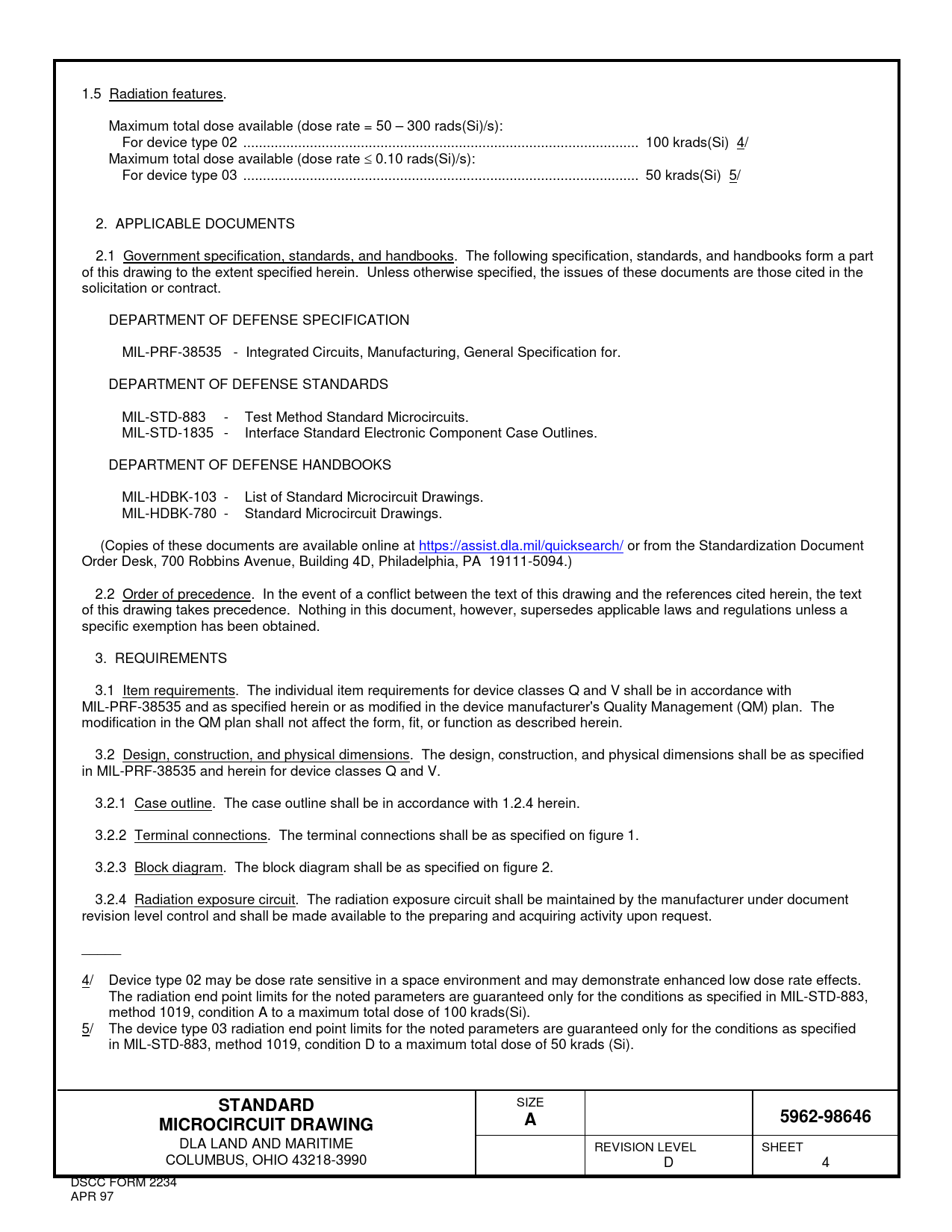 DLA LAND AND MARITIME REVISION LEVEL SHEET COLUMBUS, OHIO 43218-3990 D 4 DSCC FORM 2234 APR 97 Document Outline DEPARTMENT OF DEFENSE SPECIFICATION DEPARTMENT OF DEFENSE STANDARDS
