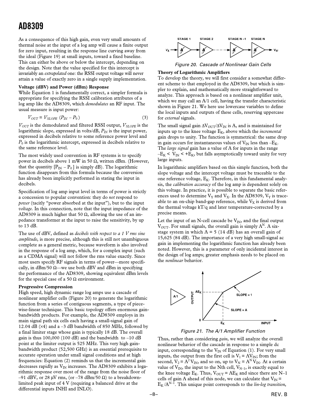 AD8309 As a consequence of this high gain, even very small amounts of STAGE 1STAGE 2STAGE N –1STAGE N thermal noise at the input of a log amp will cause a finite output for zero input, resulting in the response line curving away from VXAAAAVW the ideal (Figure 19) at small inputs, toward a fixed baseline. This can either be above or below the intercept, depending on Figure 20. Cascade of Nonlinear Gain Cells the design. Note that the value specified for this intercept is invariably an extrapolated one: the RSSI output voltage will never Theory of Logarithmic Amplifiers attain a value of exactly zero in a single supply implementation. To develop the theory, we will first consider a somewhat differ- ent scheme to that employed in the AD8309, but which is sim- Voltage (dBV) and Power (dBm) Response pler to explain, and mathematically more straightforward to While Equation 1 is fundamentally correct, a simpler formula is analyze. This approach is based on a nonlinear amplifier unit, appropriate for specifying the RSSI calibration attributes of a which we may call an A/1 cell, having the transfer characteristic log amp like the AD8309, which demodulates an RF input. The shown in Figure 21. We here use lowercase variables to define usual measure is input power: the local inputs and outputs of these cells, reserving uppercase VOUT = VSLOPE (PIN – P0 ) (3) for external signals. VOUT is the demodulated and filtered RSSI output, VSLOPE is the The small signal gain ∆VOUT/∆VIN is A, and is maintained for logarithmic slope, expressed in volts/dB, PIN is the input power, inputs up to the knee voltage EK, above which the incremental expressed in decibels relative to some reference power level and gain drops to unity. The function is symmetrical: the same drop P0 is the logarithmic intercept, expressed in decibels relative to in gain occurs for instantaneous values of VIN less than –EK. the same reference level. The large signal gain has a value of A for inputs in the range The most widely used convention in RF systems is to specify –EK < VIN < +EK, but falls asymptotically toward unity for very power in decibels above 1 mW in 50 Ω, written dBm. (However, large inputs. that the quantity [PIN – P0 ] is simply dB). The logarithmic In logarithmic amplifiers based on this simple function, both the function disappears from this formula because the conversion slope voltage and the intercept voltage must be traceable to the has already been implicitly performed in stating the input in one reference voltage, EK. Therefore, in this fundamental analy- decibels. sis, the calibration accuracy of the log amp is dependent solely on Specification of log amp input level in terms of power is strictly this voltage. In practice, it is possible to separate the basic refer- a concession to popular convention: they do not respond to ences used to determine VY and VX. In the AD8309, VY is trace- power (tacitly “power absorbed at the input”), but to the input able to an on-chip band-gap reference, while VX is derived from voltage. In this connection, note that the input impedance of the the thermal voltage kT/q and later temperature-corrected by a AD8309 is much higher that 50 Ω, allowing the use of an im- precise means. pedance transformer at the input to raise the sensitivity, by up Let the input of an N-cell cascade be VIN, and the final output to 13 dB. VOUT. For small signals, the overall gain is simply AN. A six- The use of dBV, defined as decibels with respect to a 1 V rms sine stage system in which A = 5 (14 dB) has an overall gain of amplitude, is more precise, although this is still not unambiguous 15,625 (84 dB). The importance of a very high small-signal ac complete as a general metric, because waveform is also involved gain in implementing the logarithmic function has already been in the response of a log amp, which, for a complex input (such noted. However, this is a parameter of only incidental interest in as a CDMA signal) will not follow the rms value exactly. Since the design of log amps; greater emphasis needs to be placed on most users specify RF signals in terms of power—more specifi- the nonlinear behavior. cally, in dBm/50 Ω—we use both dBV and dBm in specifying the performance of the AD8309, showing equivalent dBm levels for the special case of a 50 Ω environment. Progressive Compression High speed, high dynamic range log amps use a cascade of AEKSLOPE = 1 nonlinear amplifier cells (Figure 20) to generate the logarithmic A/1 function from a series of contiguous segments, a type of piece- OUTPUT wise-linear technique. This basic topology offers enormous gain- SLOPE = A bandwidth products. For example, the AD8309 employs in its main signal path six cells each having a small-signal gain of 0EKINPUT 12.04 dB (×4) and a –3 dB bandwidth of 850 MHz, followed by a final limiter stage whose gain is typically 18 dB. The overall Figure 21. The A/1 Amplifier Function gain is thus 100,000 (100 dB) and the bandwidth to –10 dB Thus, rather than considering gain, we will analyze the overall point at the limiter output is 525 MHz. This very high gain- nonlinear behavior of the cascade in response to a simple dc bandwidth product (52,500 GHz) is an essential prerequisite to input, corresponding to the VIN of Equation (1). For very small accurate operation under small signal conditions and at high inputs, the output from the first cell is V1 = AVIN; from the frequencies: Equation (2) reminds us that the incremental gain second, V2 = A2 VIN, and so on, up to VN = AN VIN. At a certain decreases rapidly as VIN increases. The AD8309 exhibits a loga- value of VIN, the input to the Nth cell, VN–1, is exactly equal to rithmic response over most of the range from the noise floor of the knee voltage EK. Thus, VOUT = AEK and since there are N–1 –91 dBV, or 28 µV rms, (or –78 dBm/50 Ω) to a breakdown- cells of gain A ahead of this node, we can calculate that VIN = limited peak input of 4 V (r