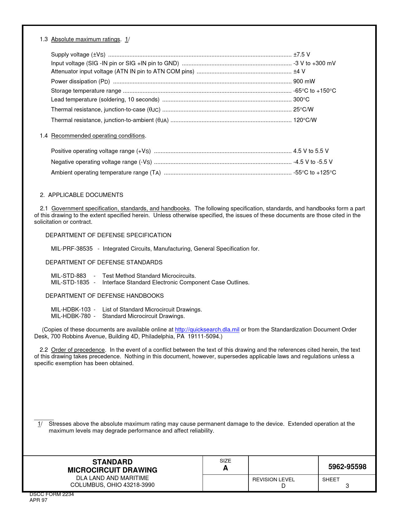 1.3 Absolute maximum ratings. 1/ Supply voltage (±VS) .. ±7.5 V Input voltage (SIG -IN pin or SIG +IN pin to GND) ... -3 V to +300 mV Attenuator input voltage (ATN IN pin to ATN COM pins) .. ±4 V Power dissipation (PD) ... 900 mW Storage temperature range ... -65C to +150C Lead temperature (soldering, 10 seconds) ... 300C Thermal resistance, junction-to-case (JC) ... 25C/W Thermal resistance, junction-to-ambient (JA) .. 120C/W 1.4 Recommended operating conditions. Positive operating voltage range (+VS) .. 4.5 V to 5.5 V Negative operating voltage range (-VS) .. -4.5 V to -5.5 V Ambient operating temperature range (TA) .. -55C to +125C 2. APPLICABLE DOCUMENTS 2.1 Government specification, standards, and handbooks. The following specification, standards, and handbooks form a part of this drawing to the extent specified herein. Unless otherwise specified, the issues of these documents are those cited in the solicitation or contract. DEPARTMENT OF DEFENSE SPECIFICATION MIL-PRF-38535 - Integrated Circuits, Manufacturing, General Specification for. DEPARTMENT OF DEFENSE STANDARDS MIL-STD-883 - Test Method Standard Microcircuits. MIL-STD-1835 - Interface Standard Electronic Component Case Outlines. DEPARTMENT OF DEFENSE HANDBOOKS MIL-HDBK-103 - List of Standard Microcircuit Drawings. MIL-HDBK-780 - Standard Microcircuit Drawings. (Copies of these documents are available online at http://quicksearch.dla.mil or from the Standardization Document Order Desk, 700 Robbins Avenue, Building 4D, Philadelphia, PA 19111-5094.) 2.2 Order of precedence. In the event of a conflict between the text of this drawing and the references cited herein, the text of this drawing takes precedence. Nothing in this document, however, supersedes applicable laws and regulations unless a specific exemption has been obtained. ______ 1/ Stresses above the absolute maximum rating may cause permanent damage to the device. Extended operation at the maximum levels may degrade performance and affect reliability.