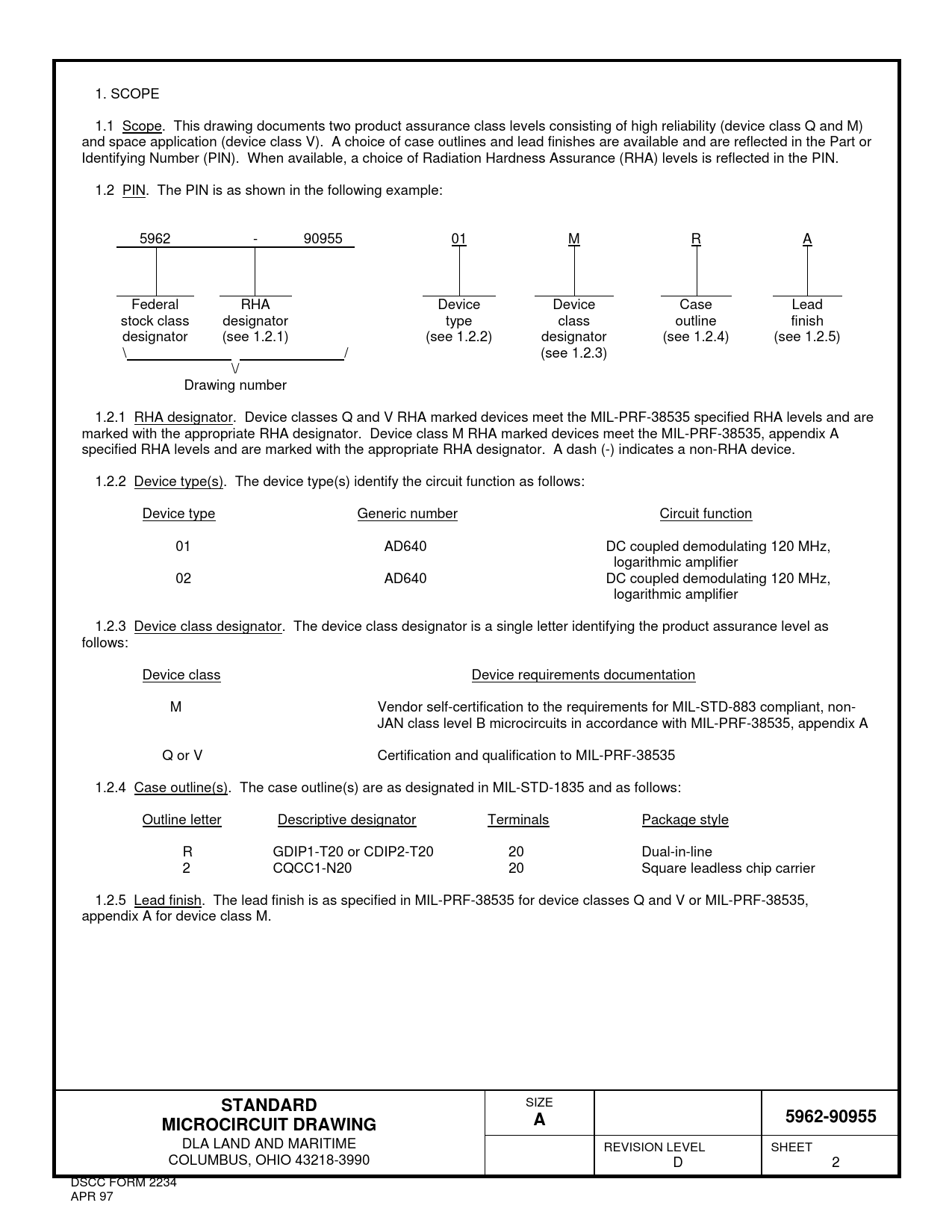 1. SCOPE 1.1 Scope. This drawing documents two product assurance class levels consisting of high reliability (device class Q and M) and space application (device class V). A choice of case outlines and lead finishes are available and are reflected in the Part or Identifying Number (PIN). When available, a choice of Radiation Hardness Assurance (RHA) levels is reflected in the PIN. 1.2 PIN. The PIN is as shown in the following example: 5962 - 90955 01 M R A Federal RHA Device Device Case Lead stock class designator type class outline finish designator (see 1.2.1) (see 1.2.2) designator (see 1.2.4) (see 1.2.5) \ / (see 1.2.3) \/ Drawing number 1.2.1 RHA designator. Device classes Q and V RHA marked devices meet the MIL-PRF-38535 specified RHA levels and are marked with the appropriate RHA designator. Device class M RHA marked devices meet the MIL-PRF-38535, appendix A specified RHA levels and are marked with the appropriate RHA designator. A dash (-) indicates a non-RHA device. 1.2.2 Device type(s). The device type(s) identify the circuit function as follows: Device type Generic number Circuit function 01 AD640 DC coupled demodulating 120 MHz, logarithmic amplifier 02 AD640 DC coupled demodulating 120 MHz, logarithmic amplifier 1.2.3 Device class designator. The device class designator is a single letter identifying the product assurance level as follows: Device class Device requirements documentation M Vendor self-certification to the requirements for MIL-STD-883 compliant, non- JAN class level B microcircuits in accordance with MIL-PRF-38535, appendix A Q or V Certification and qualification to MIL-PRF-38535 1.2.4 Case outline(s). The case outline(s) are as designated in MIL-STD-1835 and as follows: Outline letter Descriptive designator Terminals Package style R GDIP1-T20 or CDIP2-T20 20 Dual-in-line 2 CQCC1-N20 20 Square leadless chip carrier 1.2.5 Lead finish. The lead finish is as specified in MIL-PRF-38535 for device classes Q and V or MIL-PRF-38535, appendix A for device class M.