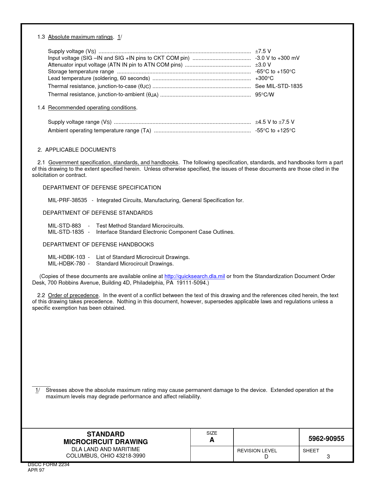 1.3 Absolute maximum ratings. 1/ Supply voltage (VS) ... 7.5 V Input voltage (SIG –IN and SIG +IN pins to CKT COM pin) .. -3.0 V to +300 mV Attenuator input voltage (ATN IN pin to ATN COM pins) ... 3.0 V Storage temperature range ... -65C to +150C Lead temperature (soldering, 60 seconds) .. +300C Thermal resistance, junction-to-case (JC) .. See MIL-STD-1835 Thermal resistance, junction-to-ambient (JA) ... 95C/W 1.4 Recommended operating conditions. Supply voltage range (VS) ... 4.5 V to 7.5 V Ambient operating temperature range (TA) ... -55C to +125C 2. APPLICABLE DOCUMENTS 2.1 Government specification, standards, and handbooks. The following specification, standards, and handbooks form a part of this drawing to the extent specified herein. Unless otherwise specified, the issues of these documents are those cited in the solicitation or contract. DEPARTMENT OF DEFENSE SPECIFICATION MIL-PRF-38535 - Integrated Circuits, Manufacturing, General Specification for. DEPARTMENT OF DEFENSE STANDARDS MIL-STD-883 - Test Method Standard Microcircuits. MIL-STD-1835 - Interface Standard Electronic Component Case Outlines. DEPARTMENT OF DEFENSE HANDBOOKS MIL-HDBK-103 - List of Standard Microcircuit Drawings. MIL-HDBK-780 - Standard Microcircuit Drawings. (Copies of these documents are available online at http://quicksearch.dla.mil or from the Standardization Document Order Desk, 700 Robbins Avenue, Building 4D, Philadelphia, PA 19111-5094.) 2.2 Order of precedence. In the event of a conflict between the text of this drawing and the references cited herein, the text of this drawing takes precedence. Nothing in this document, however, supersedes applicable laws and regulations unless a specific exemption has been obtained. ______ 1/ Stresses above the absolute maximum rating may cause permanent damage to the device. Extended operation at the maximum levels may degrade performance and affect reliability.