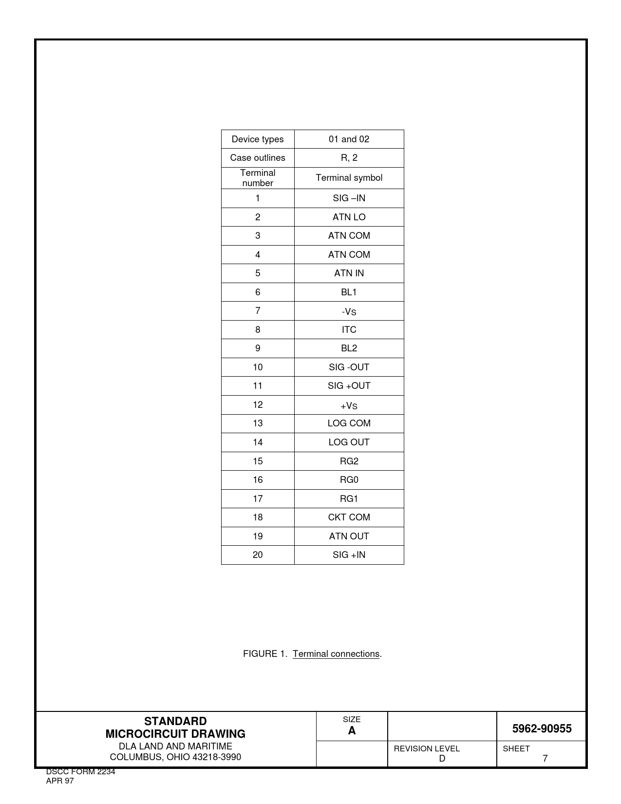 Device types 01 and 02 Case outlines R, 2 Terminal Terminal symbol number 1 SIG –IN 2 ATN LO 3 ATN COM 4 ATN COM 5 ATN IN 6 BL1 7 -VS 8 ITC 9 BL2 10 SIG -OUT 11 SIG +OUT 12 +VS 13 LOG COM 14 LOG OUT 15 RG2 16 RG0 17 RG1 18 CKT COM 19 ATN OUT 20 SIG +IN FIGURE 1. Terminal connections. STANDARD SIZE 5962-90955MICROCIRCUIT DRAWINGA DLA LAND AND MARITIME REVISION LEVEL SHEET COLUMBUS, OHIO 43218-3990 D 7 DSCC FORM 2234 APR 97