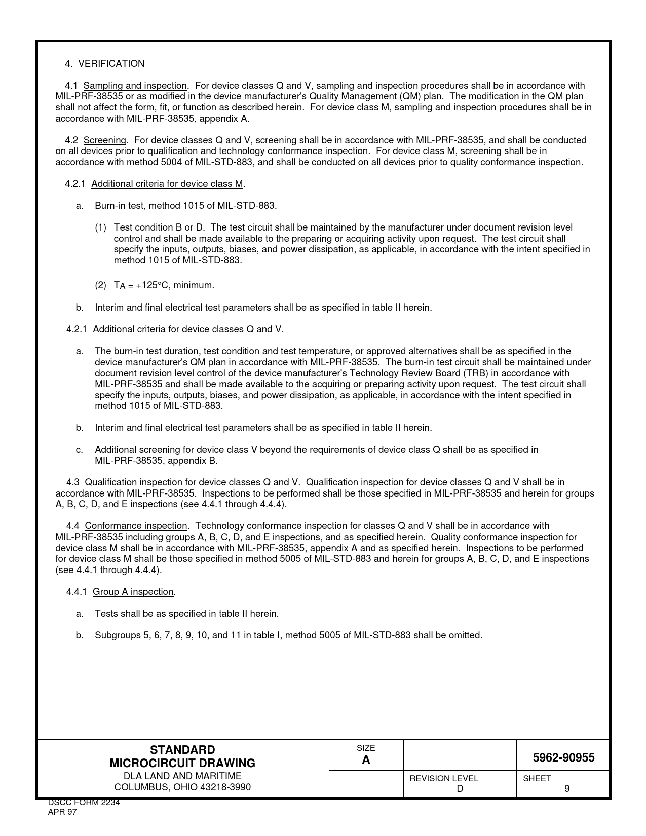 4. VERIFICATION 4.1 Sampling and inspection. For device classes Q and V, sampling and inspection procedures shall be in accordance with MIL-PRF-38535 or as modified in the device manufacturer's Quality Management (QM) plan. The modification in the QM plan shall not affect the form, fit, or function as described herein. For device class M, sampling and inspection procedures shall be in accordance with MIL-PRF-38535, appendix A. 4.2 Screening. For device classes Q and V, screening shall be in accordance with MIL-PRF-38535, and shall be conducted on all devices prior to qualification and technology conformance inspection. For device class M, screening shall be in accordance with method 5004 of MIL-STD-883, and shall be conducted on all devices prior to quality conformance inspection. 4.2.1 Additional criteria for device class M. a. Burn-in test, method 1015 of MIL-STD-883. (1) Test condition B or D. The test circuit shall be maintained by the manufacturer under document revision level control and shall be made available to the preparing or acquiring activity upon request. The test circuit shall specify the inputs, outputs, biases, and power dissipation, as applicable, in accordance with the intent specified in method 1015 of MIL-STD-883. (2) TA = +125C, minimum. b. Interim and final electrical test parameters shall be as specified in table II herein. 4.2.1 Additional criteria for device classes Q and V. a. The burn-in test duration, test condition and test temperature, or approved alternatives shall be as specified in the device manufacturer's QM plan in accordance with MIL-PRF-38535. The burn-in test circuit shall be maintained under document revision level control of the device manufacturer's Technology Review Board (TRB) in accordance with MIL-PRF-38535 and shall be made available to the acquiring or preparing activity upon request. The test circuit shall specify the inputs, outputs, biases, and power dissipation, as applicable, in accordance with the intent specified in method 1015 of MIL-STD-883. b. Interim and final electrical test parameters shall be as specified in table II herein. c. Additional screening for device class V beyond the requirements of device class Q shall be as specified in MIL-PRF-38535, appendix B. 4.3 Qualification inspection for device classes Q and V. Qualification inspection for device classes Q and V shall be in accordance with MIL-PRF-38535. Inspections to be performed shall be those specified in MIL-PRF-38535 and herein for groups A, B, C, D, and E inspections (see 4.4.1 through 4.4.4). 4.4 Conformance inspection. Technology conformance inspection for classes Q and V shall be in accordance with MIL-PRF-38535 including groups A, B, C, D, and E inspections, and as specified herein. Quality conformance inspection for device class M shall be in accordance with MIL-PRF-38535, appendix A and as specified herein. Inspections to be performed for device class M shall be those specified in method 5005 of MIL-STD-883 and herein for groups A, B, C, D, and E inspections (see 4.4.1 through 4.4.4). 4.4.1 Group A inspection. a. Tests shall be as specified in table II herein. b. Subgroups 5, 6, 7, 8, 9, 10, and 11 in table I, method 5005 of MIL-STD-883 shall be omitted.