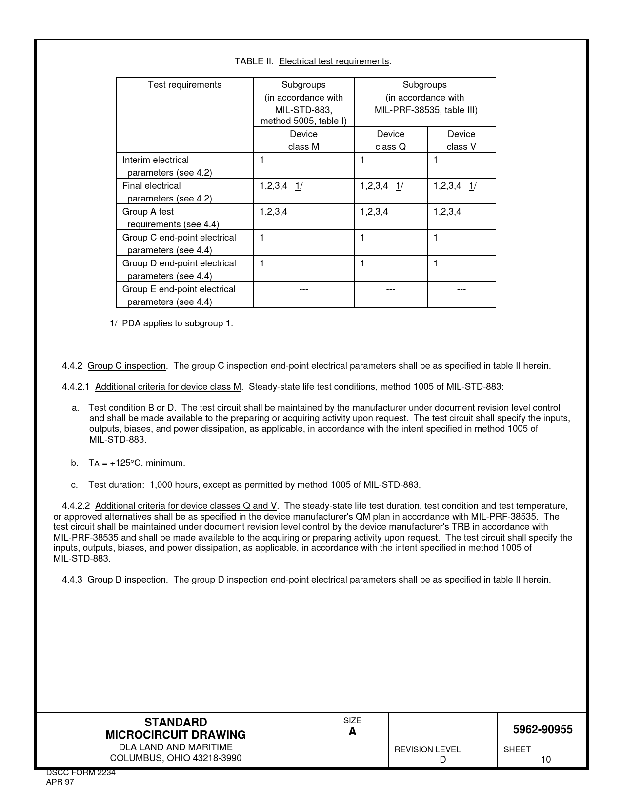TABLE II. Electrical test requirements. Test requirements Subgroups Subgroups (in accordance with (in accordance with MIL-STD-883, MIL-PRF-38535, table III) method 5005, table I) Device Device Device class M class Q class V Interim electrical 1 1 1 parameters (see 4.2) Final electrical 1,2,3,4 1/ 1,2,3,4 1/ 1,2,3,4 1/ parameters (see 4.2) Group A test 1,2,3,4 1,2,3,4 1,2,3,4 requirements (see 4.4) Group C end-point electrical 1 1 1 parameters (see 4.4) Group D end-point electrical 1 1 1 parameters (see 4.4) Group E end-point electrical --- --- --- parameters (see 4.4) 1/ PDA applies to subgroup 1. 4.4.2 Group C inspection. The group C inspection end-point electrical parameters shall be as specified in table II herein. 4.4.2.1 Additional criteria for device class M. Steady-state life test conditions, method 1005 of MIL-STD-883: a. Test condition B or D. The test circuit shall be maintained by the manufacturer under document revision level control and shall be made available to the preparing or acquiring activity upon request. The test circuit shall specify the inputs, outputs, biases, and power dissipation, as applicable, in accordance with the intent specified in method 1005 of MIL-STD-883. b. TA = +125C, minimum. c. Test duration: 1,000 hours, except as permitted by method 1005 of MIL-STD-883. 4.4.2.2 Additional criteria for device classes Q and V. The steady-state life test duration, test condition and test temperature, or approved alternatives shall be as specified in the device manufacturer's QM plan in accordance with MIL-PRF-38535. The test circuit shall be maintained under document revision level control by the device manufacturer's TRB in accordance with MIL-PRF-38535 and shall be made available to the acquiring or preparing activity upon request. The test circuit shall specify the inputs, outputs, biases, and power dissipation, as applicable, in accordance with the intent specified in method 1005 of MIL-STD-883. 4.4.3 Group D inspection. The group D inspection end-point electrical parameters shall be as specified in table II herein.