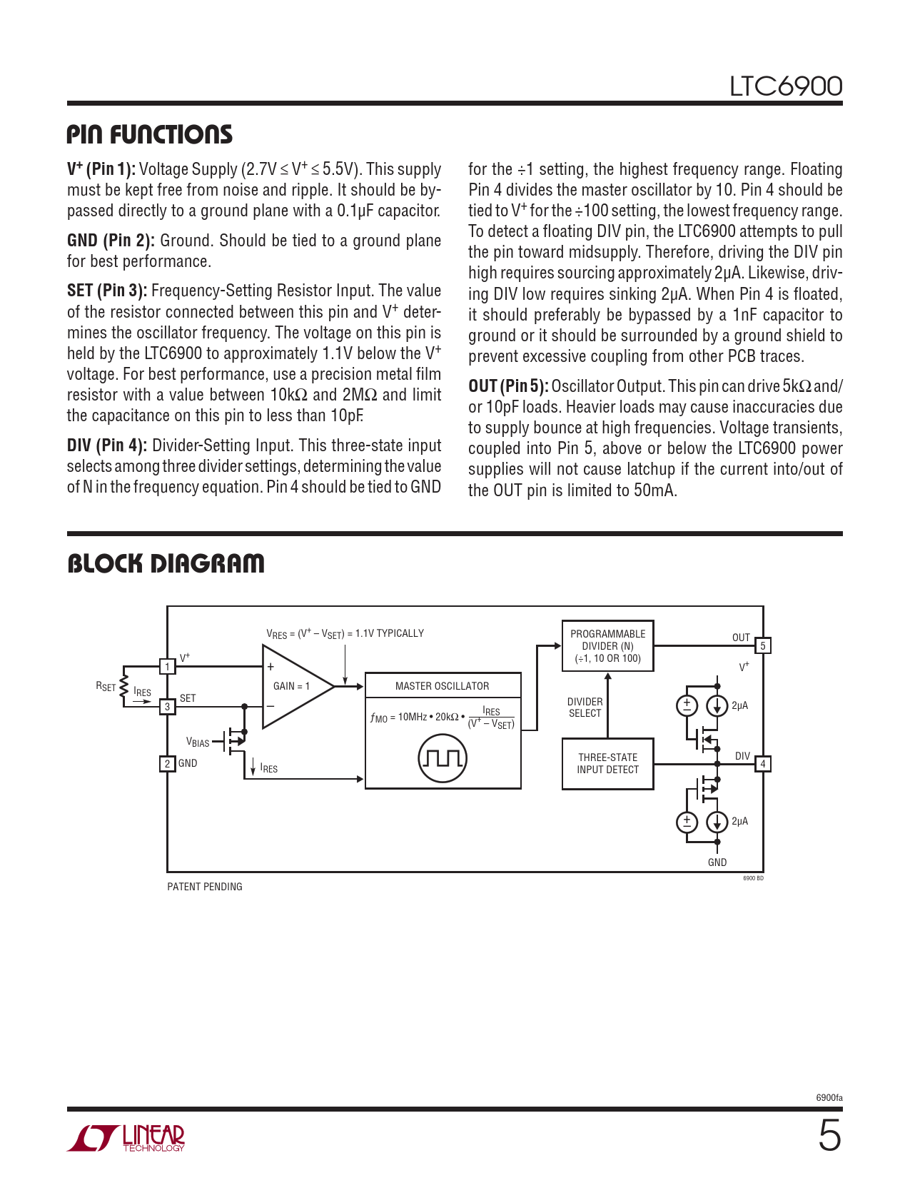 LTC6900 PIN FUNCTIONSV+ (Pin 1): Voltage Supply (2.7V ≤ V+ ≤ 5.5V). This supply for the ÷1 setting, the highest frequency range. Floating must be kept free from noise and ripple. It should be by- Pin 4 divides the master oscillator by 10. Pin 4 should be passed directly to a ground plane with a 0.1μF capacitor. tied to V+ for the ÷100 setting, the lowest frequency range. To detect a fl oating DIV pin, the LTC6900 attempts to pull GND (Pin 2): Ground. Should be tied to a ground plane the pin toward midsupply. Therefore, driving the DIV pin for best performance. high requires sourcing approximately 2μA. Likewise, driv- SET (Pin 3): Frequency-Setting Resistor Input. The value ing DIV low requires sinking 2μA. When Pin 4 is fl oated, of the resistor connected between this pin and V+ deter- it should preferably be bypassed by a 1nF capacitor to mines the oscillator frequency. The voltage on this pin is ground or it should be surrounded by a ground shield to held by the LTC6900 to approximately 1.1V below the V+ prevent excessive coupling from other PCB traces. voltage. For best performance, use a precision metal fi lm OUT (Pin 5): Oscillator Output. This pin can drive 5kΩ and/ resistor with a value between 10kΩ and 2MΩ and limit or 10pF loads. Heavier loads may cause inaccuracies due the capacitance on this pin to less than 10pF. to supply bounce at high frequencies. Voltage transients, DIV (Pin 4): Divider-Setting Input. This three-state input coupled into Pin 5, above or below the LTC6900 power selects among three divider settings, determining the value supplies will not cause latchup if the current into/out of of N in the frequency equation. Pin 4 should be tied to GND the OUT pin is limited to 50mA. BLOCK DIAGRAM VRES = (V+ – VSET) = 1.1V TYPICALLY PROGRAMMABLE OUT DIVIDER (N) 5 V+ (÷1, 10 OR 100) 1 + V+ RSET GAIN = 1 I MASTER OSCILLATOR RES SET DIVIDER + 3 – I 2μA RES – ƒ SELECT MO = 10MHz • 20kΩ • (V+ – VSET) VBIAS THREE-STATE DIV 2 GND I 4 RES INPUT DETECT + 2μA – GND 6900 BD PATENT PENDING 6900fa 5