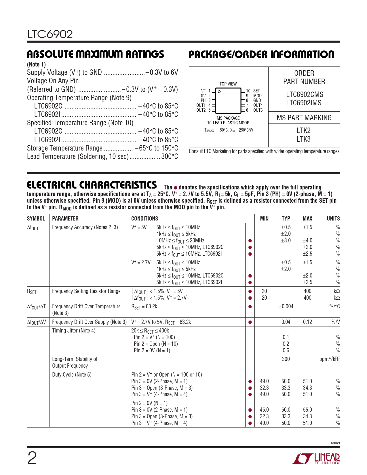 Supply Voltage (V+) to GND ..– 0.3V to 6V ORDER Voltage On Any Pin TOP VIEW PART NUMBER (Referred to GND) ... – 0.3V to (V+ + 0.3V) V+ 1 10 SET Operating Temperature Range (Note 9) DIV 2 9 MOD LTC6902CMS PH 3 8 GND LTC6902C .. – 40°C to 85°C LTC6902IMS OUT1 4 7 OUT4 OUT2 5 6 OUT3 LTC6902I .. – 40°C to 85°C MS PACKAGE MS PART MARKING Specified Temperature Range (Note 10) 10-LEAD PLASTIC MSOP LTC6902C .. – 40°C to 85°C TJMAX = 150°C, θJA = 250°C/W LTK2 LTC6902I .. – 40°C to 85°C LTK3 Storage Temperature Range ... – 65°C to 150°C Consult LTC Marketing for parts specified with wider operating temperature ranges. Lead Temperature (Soldering, 10 sec).. 300°C