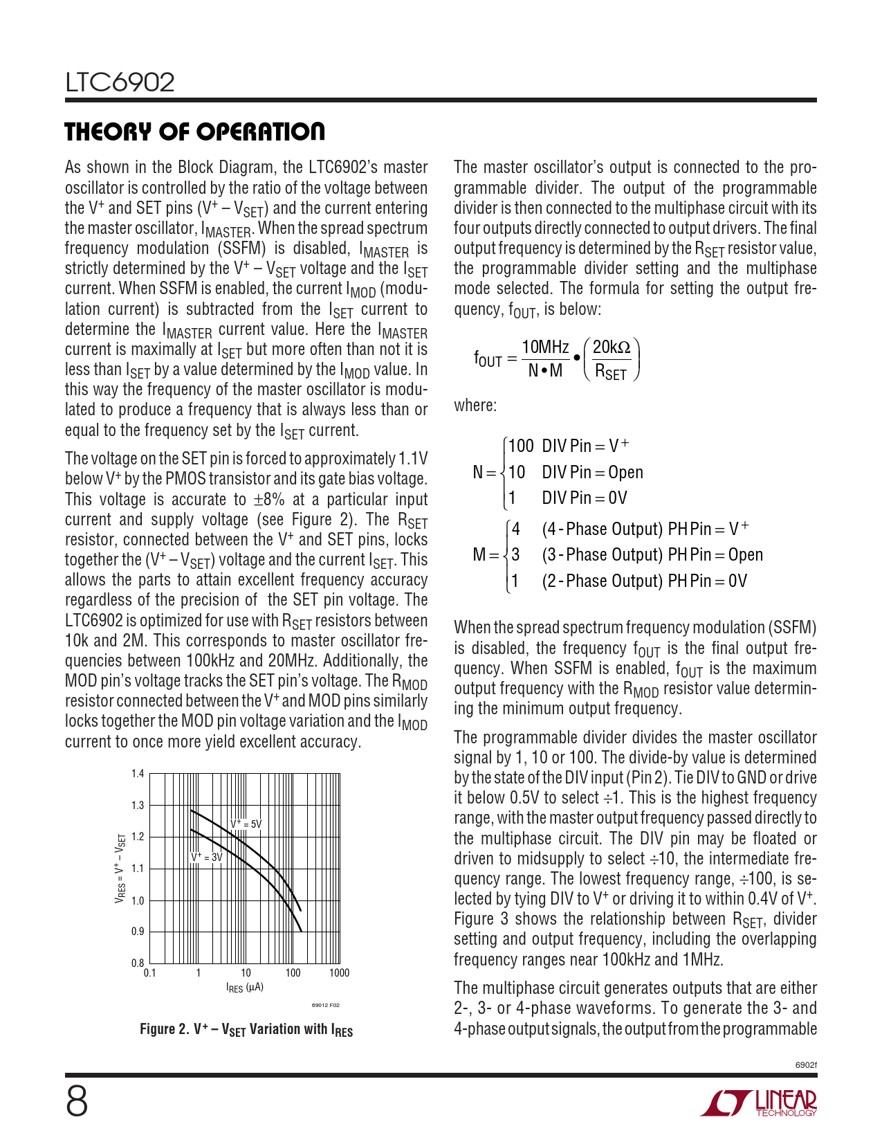 LTC6902 UTHEORY OF OPERATIO As shown in the Block Diagram, the LTC6902’s master The master oscillator’s output is connected to the pro- oscillator is controlled by the ratio of the voltage between grammable divider. The output of the programmable the V+ and SET pins (V+ – VSET) and the current entering divider is then connected to the multiphase circuit with its the master oscillator, IMASTER. When the spread spectrum four outputs directly connected to output drivers. The final frequency modulation (SSFM) is disabled, IMASTER is output frequency is determined by the RSET resistor value, strictly determined by the V+ – VSET voltage and the ISET the programmable divider setting and the multiphase current. When SSFM is enabled, the current IMOD (modu- mode selected. The formula for setting the output fre- lation current) is subtracted from the ISET current to quency, fOUT, is below: determine the IMASTER current value. Here the IMASTER current is maximally at I MHz 10 k 20 SET but more often than not it is f = • Ω less than I OUT SET by a value determined by the IMOD value. In N • M RSET this way the frequency of the master oscillator is modu- lated to produce a frequency that is always less than or where: equal to the frequency set by the ISET current. 100 DIV Pin = + V The voltage on the SET pin is forced to approximately 1.1V below V+ by the PMOS transistor and its gate bias voltage. N = 10 DIV Pin = Open This voltage is accurate to ±8% at a particular input 1 DIV Pin = 0V current and supply voltage (see Figure 2). The RSET 4 (4-Phase Output) PHPin = + V resistor, connected between the V+ and SET pins, locks together the (V+ – V M = 3 (3 - H Phase Output) P Pin = Open SET) voltage and the current ISET. This allows the parts to attain excellent frequency accuracy 1 (2- H Phase Output) P Pin = 0V regardless of the precision of the SET pin voltage. The LTC6902 is optimized for use with RSET resistors between When the spread spectrum frequency modulation (SSFM) 10k and 2M. This corresponds to master oscillator fre- is disabled, the frequency fOUT is the final output fre- quencies between 100kHz and 20MHz. Additionally, the quency. When SSFM is enabled, fOUT is the maximum MOD pin’s voltage tracks the SET pin’s voltage. The RMOD output frequency with the RMOD resistor value determin- resistor connected between the V+ and MOD pins similarly ing the minimum output frequency. locks together the MOD pin voltage variation and the IMOD current to once more yield excellent accuracy. The programmable divider divides the master oscillator signal by 1, 10 or 100. The divide-by value is determined 1.4 by the state of the DIV input (Pin 2). Tie DIV to GND or drive it below 0.5V to select ÷1. This is the highest frequency 1.3 range, with the master output frequency passed directly to V+ = 5V 1.2 SET the multiphase circuit. The DIV pin may be floated or – V V+ = 3V + driven to midsupply to select ÷10, the intermediate fre- 1.1 = V quency range. The lowest frequency range, ÷100, is se- RESV 1.0 lected by tying DIV to V+ or driving it to within 0.4V of V+. Figure 3 shows the relationship between RSET, divider 0.9 setting and output frequency, including the overlapping 0.8 frequency ranges near 100kHz and 1MHz. 0.1 1 10 100 1000 IRES (µA) The multiphase circuit generates outputs that are either 69012 F02 2-, 3- or 4-phase waveforms. To generate the 3- and Figure 2. V+ – VSET Variation with IRES 4-phase output signals, the output from the programmable 6902f 8