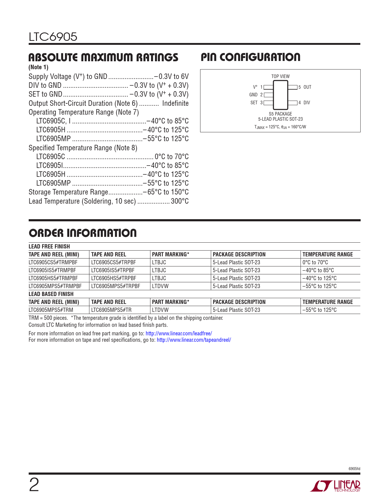 LTC6905 ABSOLUTE MAXIMUM RATINGSPIN CONFIGURATION(Note 1) Supply Voltage (V+) to GND ...– 0.3V to 6V TOP VIEW DIV to GND .. – 0.3V to (V+ + 0.3V) V+ 1 5 OUT SET to GND .. – 0.3V to (V+ + 0.3V) GND 2 Output Short-Circuit Duration (Note 6) ... Indefi nite SET 3 4 DIV Operating Temperature Range (Note 7) S5 PACKAGE LTC6905C, I ...– 40°C to 85°C 5-LEAD PLASTIC SOT-23 LTC6905H ..– 40°C to 125°C TJMAX = 125°C, θJA = 160°C/W LTC6905MP ...– 55°C to 125°C Specifi ed Temperature Range (Note 8) LTC6905C .. 0°C to 70°C LTC6905I..– 40°C to 85°C LTC6905H ..– 40°C to 125°C LTC6905MP ...– 55°C to 125°C Storage Temperature Range ...– 65°C to 150°C Lead Temperature (Soldering, 10 sec) .. 300°C ORDER INFORMATION LEAD FREE FINISH TAPE AND REEL (MINI)TAPE AND REELPART MARKING*PACKAGE DESCRIPTIONTEMPERATURE RANGE LTC6905CS5#TRMPBF LTC6905CS5#TRPBF LTBJC 5-Lead Plastic SOT-23 0°C to 70°C LTC6905IS5#TRMPBF LTC6905IS5#TRPBF LTBJC 5-Lead Plastic SOT-23 –40°C to 85°C LTC6905HS5#TRMPBF LTC6905HS5#TRPBF LTBJC 5-Lead Plastic SOT-23 –40°C to 125°C LTC6905MPS5#TRMPBF LTC6905MPS5#TRPBF LTDVW 5-Lead Plastic SOT-23 –55°C to 125°C LEAD BASED FINISH TAPE AND REEL (MINI)TAPE AND REELPART MARKING*PACKAGE DESCRIPTIONTEMPERATURE RANGE LTC6905MPS5#TRM LTC6905MPS5#TR LTDVW 5-Lead Plastic SOT-23 –55°C to 125°C TRM = 500 pieces. *The temperature grade is identifi ed by a label on the shipping container. Consult LTC Marketing for information on lead based fi nish parts. For more information on lead free part marking, go to: http://www.linear.com/leadfree/ For more information on tape and reel specifi cations, go to: http://www.linear.com/tapeandreel/ 6905fd 2