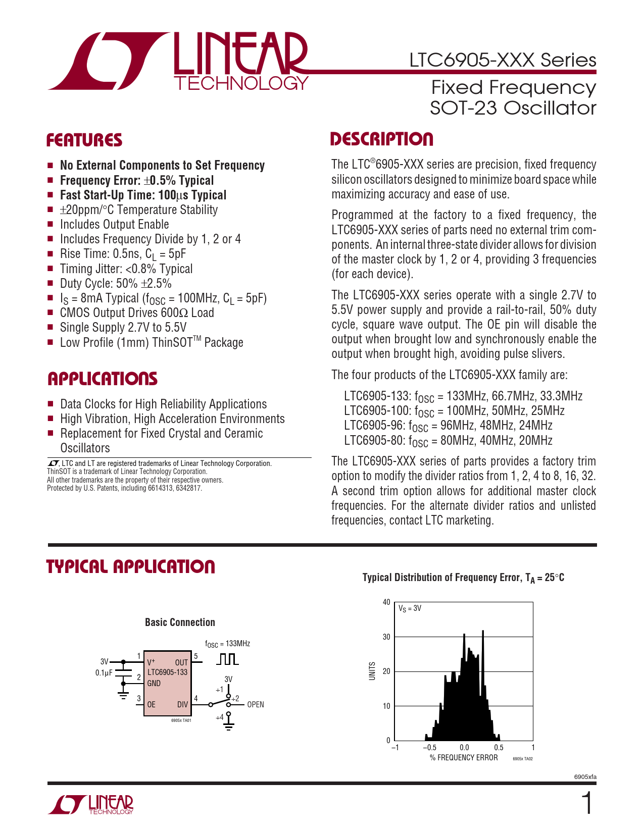 LTC6905-XXX Series Fixed Frequency SOT-23 Oscillator UFEATURESDESCRIPTIO ■ No External Components to Set Frequency The LTC®6905-XXX series are precision, fixed frequency ■ Frequency Error: ± 0.5% Typical silicon oscillators designed to minimize board space while ■ Fast Start-Up Time: 100 µ s Typical maximizing accuracy and ease of use. ■ ±20ppm/°C Temperature Stability Programmed at the factory to a fixed frequency, the ■ Includes Output Enable LTC6905-XXX series of parts need no external trim com- ■ Includes Frequency Divide by 1, 2 or 4 ponents. An internal three-state divider allows for division ■ Rise Time: 0.5ns, CL = 5pF of the master clock by 1, 2 or 4, providing 3 frequencies ■ Timing Jitter: <0.8% Typical (for each device). ■ Duty Cycle: 50% ±2.5% ■ I The LTC6905-XXX series operate with a single 2.7V to S = 8mA Typical (fOSC = 100MHz, CL = 5pF) ■ CMOS Output Drives 600Ω Load 5.5V power supply and provide a rail-to-rail, 50% duty ■ Single Supply 2.7V to 5.5V cycle, square wave output. The OE pin will disable the ■ Low Profile (1mm) ThinSOTTM Package output when brought low and synchronously enable the output when brought high, avoiding pulse slivers. U The four products of the LTC6905-XXX family are: APPLICATIO S LTC6905-133: f ■ Data Clocks for High Reliability Applications OSC = 133MHz, 66.7MHz, 33.3MHz LTC6905-100: f ■ High Vibration, High Acceleration Environments OSC = 100MHz, 50MHz, 25MHz LTC6905-96: f ■ Replacement for Fixed Crystal and Ceramic OSC = 96MHz, 48MHz, 24MHz LTC6905-80: f Oscillators OSC = 80MHz, 40MHz, 20MHz , LTC and LT are registered trademarks of Linear Technology Corporation. The LTC6905-XXX series of parts provides a factory trim ThinSOT is a trademark of Linear Technology Corporation. All other trademarks are the property of their respective owners. option to modify the divider ratios from 1, 2, 4 to 8, 16, 32. Protected by U.S. Patents, including 6614313, 6342817. A second trim option allows for additional master clock frequencies. For the alternate divider ratios and unlisted frequencies, contact LTC marketing. UTYPICAL APPLICATIOTypical Distribution of Frequency Error, TA = 25 ° C 40 VS = 3V Basic Connection 30 fOSC = 133MHz 1 5 3V V+ OUT 0.1µF LTC6905-133 20 2 3V UNITS GND ÷1 3 4 ÷2 OE DIV OPEN 10 ÷4 6905x TA01 0 –1 –0.5 0.0 0.5 1 % FREQUENCY ERROR 6905x TA02 6905xfa 1