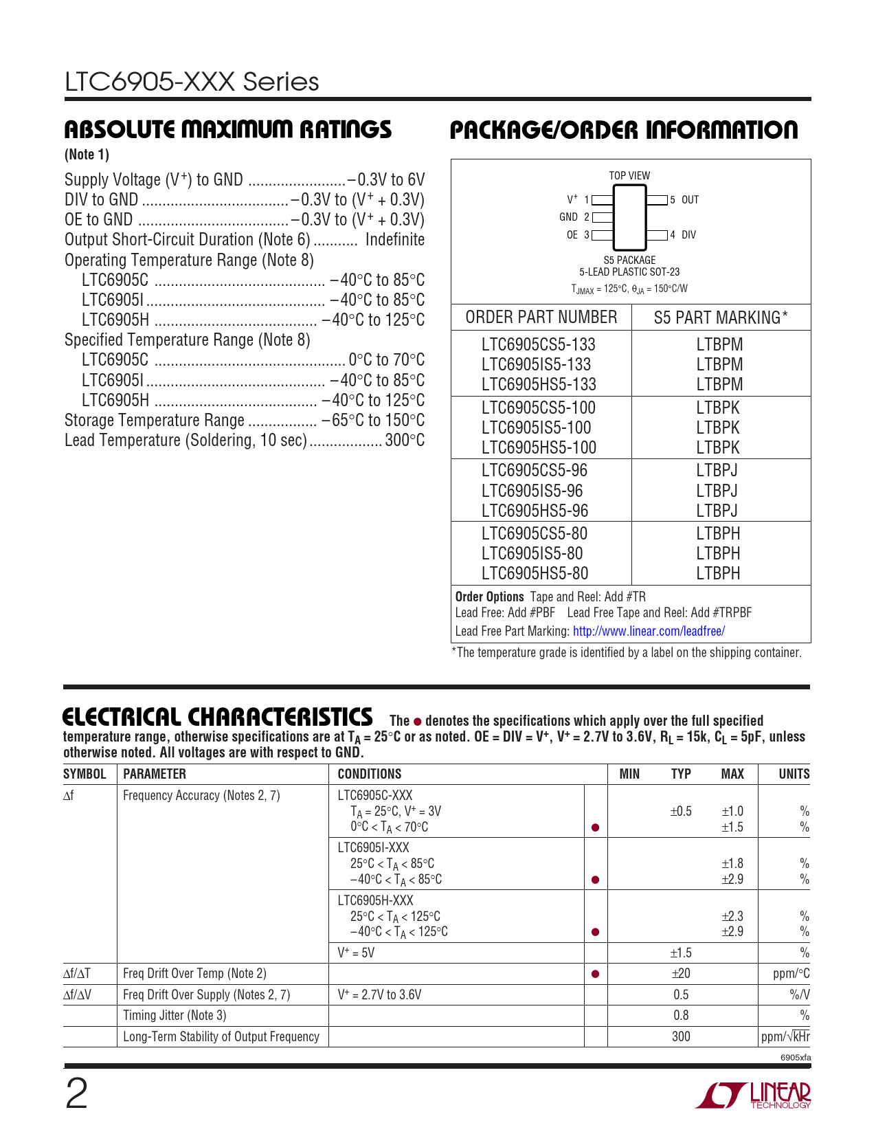 LTC6905-XXX Series WWWUUWUABSOLUTE AXI U RATI GSPACKAGE/ORDER I FOR ATIO(Note 1) Supply Voltage (V+) to GND ..– 0.3V to 6V TOP VIEW DIV to GND .. – 0.3V to (V+ + 0.3V) V+ 1 5 OUT OE to GND ... – 0.3V to (V+ + 0.3V) GND 2 Output Short-Circuit Duration (Note 6) ... Indefinite OE 3 4 DIV Operating Temperature Range (Note 8) S5 PACKAGE 5-LEAD PLASTIC SOT-23 LTC6905C .. – 40°C to 85°C TJMAX = 125°C, θJA = 150°C/W LTC6905I .. – 40°C to 85°C LTC6905H .. – 40°C to 125°C ORDER PART NUMBER S5 PART MARKING* Specified Temperature Range (Note 8) LTC6905CS5-133 LTBPM LTC6905C ... 0°C to 70°C LTC6905IS5-133 LTBPM LTC6905I .. – 40°C to 85°C LTC6905HS5-133 LTBPM LTC6905H .. – 40°C to 125°C LTC6905CS5-100 LTBPK Storage Temperature Range ... – 65°C to 150°C LTC6905IS5-100 LTBPK Lead Temperature (Soldering, 10 sec).. 300°C LTC6905HS5-100 LTBPK LTC6905CS5-96 LTBPJ LTC6905IS5-96 LTBPJ LTC6905HS5-96 LTBPJ LTC6905CS5-80 LTBPH LTC6905IS5-80 LTBPH LTC6905HS5-80 LTBPH Order Options Tape and Reel: Add #TR Lead Free: Add #PBF Lead Free Tape and Reel: Add #TRPBF Lead Free Part Marking: http://www.linear.com/leadfree/ *The temperature grade is identified by a label on the shipping container. ELECTRICAL CHARACTERISTICS The ● denotes the specifications which apply over the full specifiedtemperature range, otherwise specifications are at TA = 25 ° C or as noted. OE = DIV = V+, V+ = 2.7V to 3.6V, RL = 15k, CL = 5pF, unlessotherwise noted. All voltages are with respect to GND.SYMBOLPARAMETERCONDITIONSMINTYPMAXUNITS ∆f Frequency Accuracy (Notes 2, 7) LTC6905C-XXX TA = 25°C, V+ = 3V ±0.5 ±1.0 % 0°C < TA < 70°C ● ±1.5 % LTC6905I-XXX 25°C < TA < 85°C ±1.8 % – 40°C < TA < 85°C ● ±2.9 % LTC6905H-XXX 25°C < TA < 125°C ±2.3 % – 40°C < TA < 125°C ● ±2.9 % V+ = 5V ±1.5 % ∆f/∆T Freq Drift Over Temp (Note 2) ● ±20 ppm/°C ∆f/∆V Freq Drift Over Supply (Notes 2, 7) V+ = 2.7V to 3.6V 0.5 %/V Timing Jitter (Note 3) 0.8 % Long-Term Stability of Output Frequency 300 ppm/√kHr 6905xfa 2