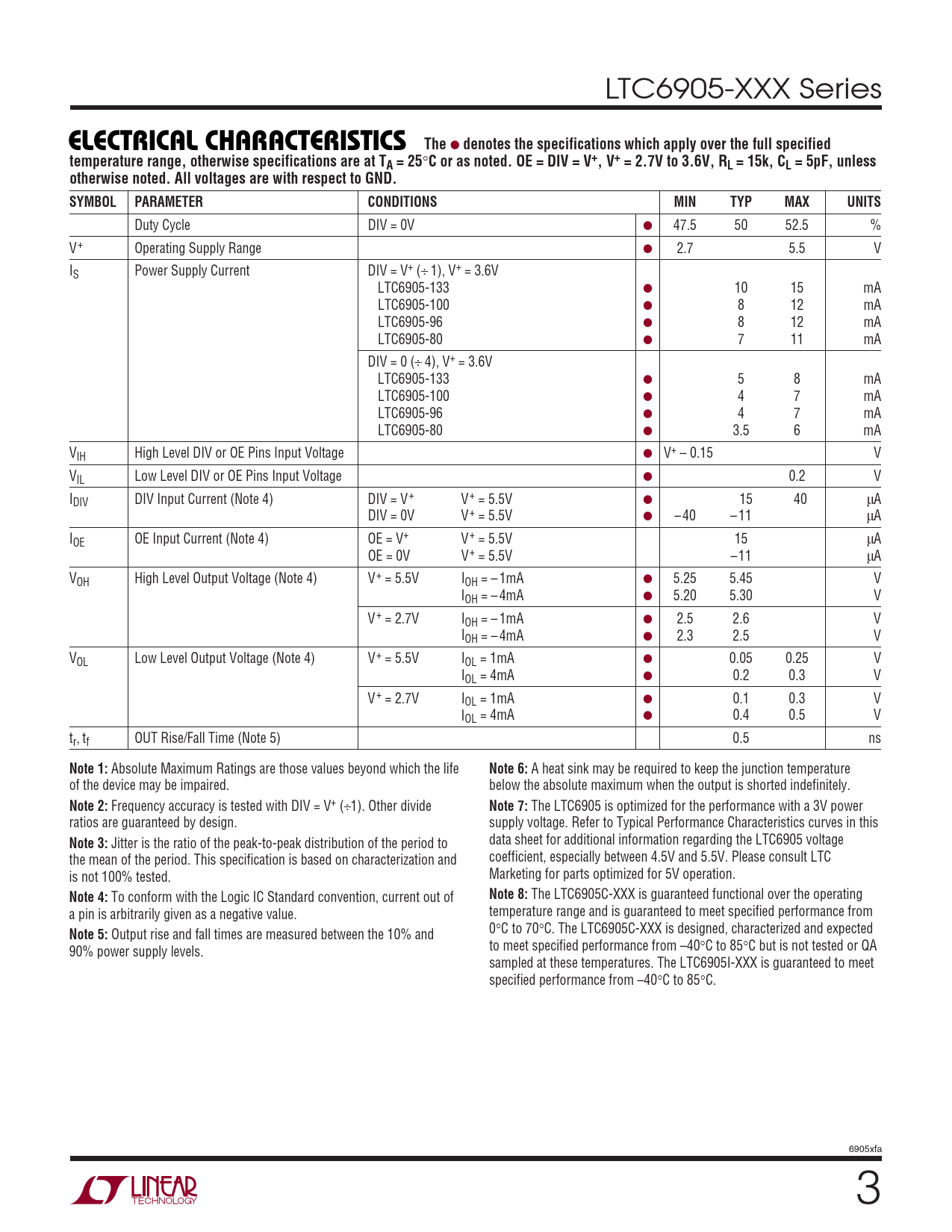 LTC6905-XXX Series ELECTRICAL CHARACTERISTICS The ● denotes the specifications which apply over the full specifiedtemperature range, otherwise specifications are at TA = 25 ° C or as noted. OE = DIV = V+, V+ = 2.7V to 3.6V, RL = 15k, CL = 5pF, unlessotherwise noted. All voltages are with respect to GND.SYMBOLPARAMETERCONDITIONSMINTYPMAXUNITS Duty Cycle DIV = 0V ● 47.5 50 52.5 % V+ Operating Supply Range ● 2.7 5.5 V IS Power Supply Current DIV = V+ (÷ 1), V+ = 3.6V LTC6905-133 ● 10 15 mA LTC6905-100 ● 8 12 mA LTC6905-96 ● 8 12 mA LTC6905-80 ● 7 11 mA DIV = 0 (÷ 4), V+ = 3.6V LTC6905-133 ● 5 8 mA LTC6905-100 ● 4 7 mA LTC6905-96 ● 4 7 mA LTC6905-80 ● 3.5 6 mA VIH High Level DIV or OE Pins Input Voltage ● V+ – 0.15 V VIL Low Level DIV or OE Pins Input Voltage ● 0.2 V IDIV DIV Input Current (Note 4) DIV = V+ V+ = 5.5V ● 15 40 µA DIV = 0V V+ = 5.5V ● – 40 – 11 µA IOE OE Input Current (Note 4) OE = V+ V+ = 5.5V 15 µA OE = 0V V+ = 5.5V –11 µA VOH High Level Output Voltage (Note 4) V+ = 5.5V IOH = – 1mA ● 5.25 5.45 V IOH = – 4mA ● 5.20 5.30 V V+ = 2.7V IOH = – 1mA ● 2.5 2.6 V IOH = – 4mA ● 2.3 2.5 V VOL Low Level Output Voltage (Note 4) V+ = 5.5V IOL = 1mA ● 0.05 0.25 V IOL = 4mA ● 0.2 0.3 V V+ = 2.7V IOL = 1mA ● 0.1 0.3 V IOL = 4mA ● 0.4 0.5 V tr, tf OUT Rise/Fall Time (Note 5) 0.5 ns Note 1: Absolute Maximum Ratings are those values beyond which the life Note 6: A heat sink may be required to keep the junction temperature of the device may be impaired. below the absolute maximum when the output is shorted indefinitely. Note 2: Frequency accuracy is tested with DIV = V+ (÷1). Other divide Note 7: The LTC6905 is optimized for the performance with a 3V power ratios are guaranteed by design. supply voltage. Refer to Typical Performance Characteristics curves in this Note 3: Jitter is the ratio of the peak-to-peak distribution of the period to data sheet for additional information regarding the LTC6905 voltage the mean of the period. This specification is based on characterization and coefficient, especially between 4.5V and 5.5V. Please consult LTC is not 100% tested. Marketing for parts optimized for 5V operation. Note 4: To conform with the Logic IC Standard convention, current out of Note 8: The LTC6905C-XXX is guaranteed functional over the operating a pin is arbitrarily given as a negative value. temperature range and is guaranteed to meet specified performance from Note 5: Output rise and fall times are measured between the 10% and 0°C to 70°C. The LTC6905C-XXX is designed, characterized and expected 90% power supply levels. to meet specified performance from –40°C to 85°C but is not tested or QA sampled at these temperatures. The LTC6905I-XXX is guaranteed to meet specified performance from –40°C to 85°C. 6905xfa 3