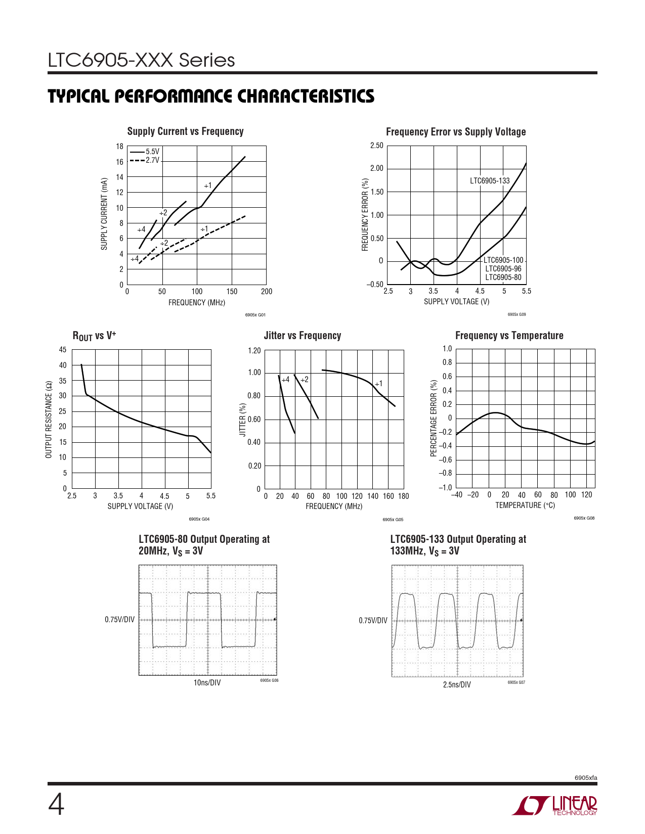 18 2.50 5.5V 16 2.7V 2.00 14 ÷ LTC6905-133 1 12 1.50 10 ÷2 1.00 8 ÷4 ÷1 6 ÷ 0.50 2 SUPPLY CURRENT (mA) FREQUENCY ERROR (%) 4 ÷4 O LTC6905-100 2 LTC6905-96 LTC6905-80 0 –0.50 0 50 100 150 200 2.5 3 3.5 4 4.5 5 5.5 FREQUENCY (MHz) SUPPLY VOLTAGE (V) 6905x G01 6905x G09