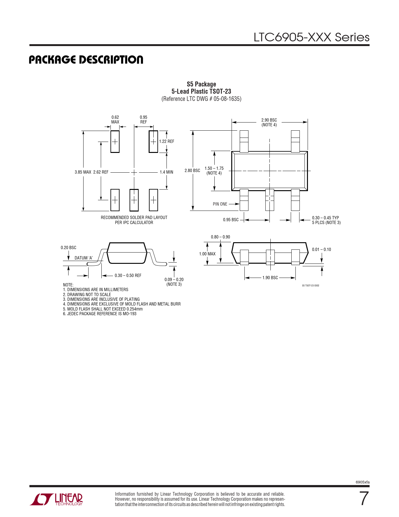 (Reference LTC DWG # 05-08-1635) 0.62 0.95 2.90 BSC MAX REF (NOTE 4) 1.22 REF 1.50 – 1.75 2.80 BSC 3.85 MAX 2.62 REF 1.4 MIN (NOTE 4) PIN ONE RECOMMENDED SOLDER PAD LAYOUT 0.30 – 0.45 TYP 0.95 BSC PER IPC CALCULATOR 5 PLCS (NOTE 3) 0.80 – 0.90 0.20 BSC 0.01 – 0.10 1.00 MAX DATUM ‘A’ 0.30 – 0.50 REF 0.09 – 0.20 1.90 BSC NOTE: (NOTE 3) S5 TSOT-23 0302 1. DIMENSIONS ARE IN MILLIMETERS 2. DRAWING NOT TO SCALE 3. DIMENSIONS ARE INCLUSIVE OF PLATING 4. DIMENSIONS ARE EXCLUSIVE OF MOLD FLASH AND METAL BURR 5. MOLD FLASH SHALL NOT EXCEED 0.254mm 6. JEDEC PACKAGE REFERENCE IS MO-193 6905xfa Information furnished by Linear Technology Corporation is believed to be accurate and reliable. However, no responsibility is assumed for its use. Linear Technology Corporation makes no represen- tation that the interconnection of its circuits as described herein will not infringe on existing patent rights. 7