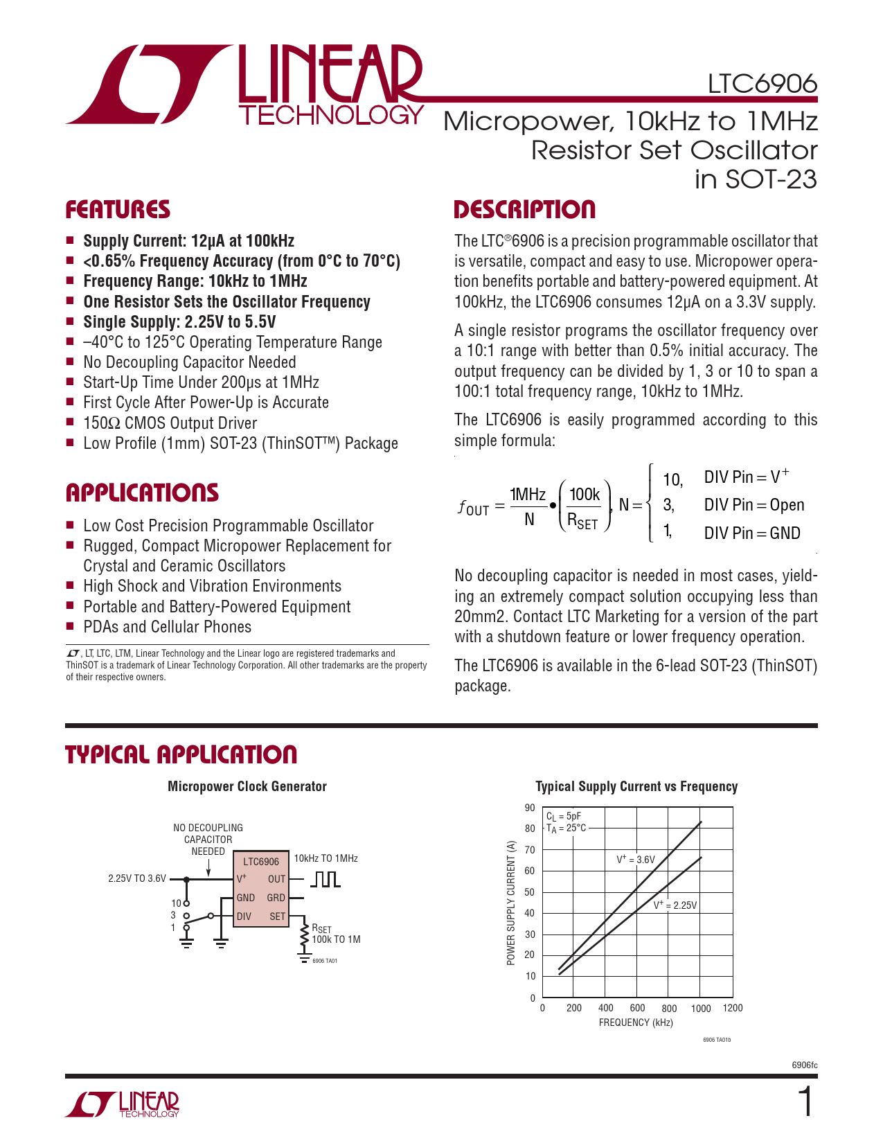 LTC6906 Micropower, 10kHz to 1MHz Resistor Set Oscillator in SOT-23 FEATURESDESCRIPTION n Supply Current: 12μA at 100kHz The LTC®6906 is a precision programmable oscillator that n <0.65% Frequency Accuracy (from 0°C to 70°C) is versatile, compact and easy to use. Micropower opera- n Frequency Range: 10kHz to 1MHz tion benefits portable and battery-powered equipment. At n One Resistor Sets the Oscillator Frequency 100kHz, the LTC6906 consumes 12μA on a 3.3V supply. n Single Supply: 2.25V to 5.5V A single resistor programs the oscillator frequency over n –40°C to 125°C Operating Temperature Range a 10:1 range with better than 0.5% initial accuracy. The n No Decoupling Capacitor Needed output frequency can be divided by 1, 3 or 10 to span a n Start-Up Time Under 200μs at 1MHz 100:1 total frequency range, 10kHz to 1MHz. n First Cycle After Power-Up is Accurate n 150Ω CMOS Output Driver The LTC6906 is easily programmed according to this n Low Profile (1mm) SOT-23 (ThinSOT™) Package simple formula: ⎧ DIV Pin = V+ ⎛ ⎞ 10, ⎪ APPLICATIONS ƒ = 1MHz • 100k ⎨ OUT ⎜ ⎟, N = 3, DIV Pin = Open n Low Cost Precision Programmable Oscillator N ⎝RSET ⎠ ⎪ 1, ⎩ DIV Pin = GND n Rugged, Compact Micropower Replacement for Crystal and Ceramic Oscillators No decoupling capacitor is needed in most cases, yield- n High Shock and Vibration Environments ing an extremely compact solution occupying less than n Portable and Battery-Powered Equipment 20mm2. Contact LTC Marketing for a version of the part n PDAs and Cellular Phones with a shutdown feature or lower frequency operation. L, LT, LTC, LTM, Linear Technology and the Linear logo are registered trademarks and ThinSOT is a trademark of Linear Technology Corporation. All other trademarks are the property The LTC6906 is available in the 6-lead SOT-23 (ThinSOT) of their respective owners. package. TYPICAL APPLICATIONMicropower Clock GeneratorTypical Supply Current vs Frequency 90 CL = 5pF NO DECOUPLING 80 TA = 25°C CAPACITOR NEEDED 70 10kHz TO 1MHz LTC6906 V+ = 3.6V 60 2.25V TO 3.6V V+ OUT 50 GND GRD 10 V+ = 2.25V 3 DIV SET 40 1 RSET 100k TO 1M 30 20 6906 TA01 POWER SUPPLY CURRENT (A) 10 0 0 200 400 600 800 1000 1200 FREQUENCY (kHz) 6906 TA01b 6906fc 1
