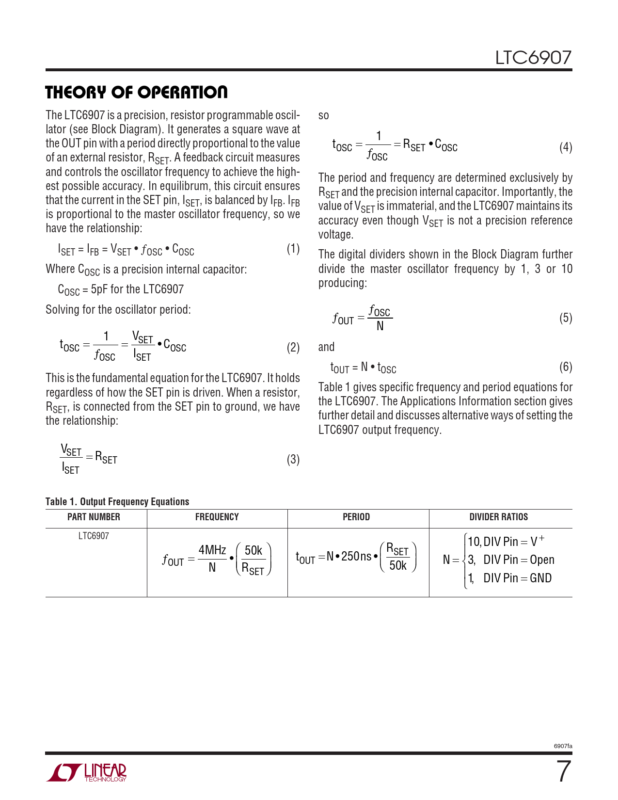 LTC6907 UTHEORY OF OPERATIO The LTC6907 is a precision, resistor programmable oscil- so lator (see Block Diagram). It generates a square wave at 1 the OUT pin with a period directly proportional to the value t = = R • C OSC SET OSC ƒ (4) of an external resistor, RSET. A feedback circuit measures OSC and controls the oscillator frequency to achieve the high- The period and frequency are determined exclusively by est possible accuracy. In equilibrum, this circuit ensures R that the current in the SET pin, I SET and the precision internal capacitor. Importantly, the SET, is balanced by IFB. IFB value of V is proportional to the master oscillator frequency, so we SET is immaterial, and the LTC6907 maintains its accuracy even though V have the relationship: SET is not a precision reference voltage. ISET = IFB = VSET • ƒOSC • COSC (1) The digital dividers shown in the Block Diagram further Where COSC is a precision internal capacitor: divide the master oscillator frequency by 1, 3 or 10 producing: COSC = 5pF for the LTC6907 Solving for the oscillator period: ƒ ƒ OSC = OUT (5) N 1 V t SET = = • C OSC ƒ (2) and I OSC OSC SET tOUT = N • tOSC (6) This is the fundamental equation for the LTC6907. It holds regardless of how the SET pin is driven. When a resistor, Table 1 gives specific frequency and period equations for R the LTC6907. The Applications Information section gives SET, is connected from the SET pin to ground, we have the relationship: further detail and discusses alternative ways of setting the LTC6907 output frequency. VSET = RSET (3) ISET Table 1. Output Frequency EquationsPART NUMBERFREQUENCYPERIODDIVIDER RATIOS LTC6907 ⎧ ,DIV Pin = + 10 V 4 ⎛ 50 ⎞ R ⎞ ƒ MHz k = SET = ⎛ • 250 • ⎪ OUT • t N ns OUT N = 3, DIV Pin = Open ⎨ N ⎝⎜R ⎝⎜ k 50 ⎠⎟ SET ⎠ ⎟ ⎪ ⎩1, DIV Pin = GND 6907fa 7